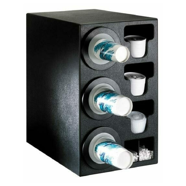 The Dispense Rite BFL-C-3BT Cup Dispensing Cabinet Adjustable is a versatile and efficient solution for beverage service operations, accommodating a range of cup sizes from 8 oz. to 44 oz. The cabinet is equipped with (3) BFL-2F adjustable cup dispensers, offering flexibility to fit cups with rim diameters between 3" and 4-1/2". Constructed from durable black texture polystyrene, the cabinet measures 24-1/2"H x 13"W x 23"D, making it a compact yet capacious addition to any service environment. The design includes (3) E-Z slide slanted lid chutes and (2) straw organizers on the side, enhancing accessibility and organization. The black bezels provide a sleek finish, while the NSF certification assures compliance with public health standards. Ideal for various market segments, including fast-food outlets, cafeterias, and self-service stations, this dispensing cabinet combines functionality with a professional aesthetic, meeting diverse operational needs with reliability and precision.