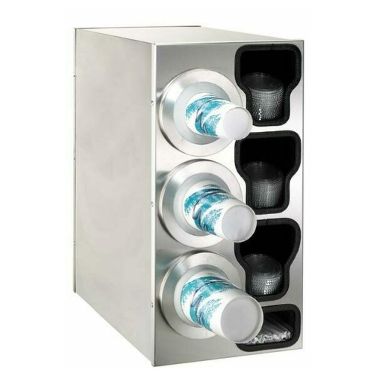 The Dispense-Rite BFL-C-3LSS Cup Dispensing Cabinet is an expertly designed unit that caters to a wide range of cup sizes, holding from 8 oz. to 44 oz. with a rim diameter of 3 inches to 4-1/2 inches. Comprised of a durable stainless steel cabinet measuring 25-3/8 inches in height, 13 inches in width, and 23 inches in depth, this dispensing cabinet is a robust solution for high-efficiency beverage service environments. It incorporates three adjustable BFL-2F cup dispensers strategically positioned on the left side, ensuring easy access and streamlined operations. On the right, three E-Z slide slanted lid chutes, alongside a straw organizer, provide convenient storage for lids and straws, optimizing space and organization. The NSF certification of the cup dispensers highlights the product's compliance with rigorous public health standards, making it a reliable choice for restaurants, cafes, and other commercial dining establishments. This dispensing cabinet delivers a unique combination of versatility and durability, tailored to meet the demands of various segments within the food and beverage industry, and stands as a testament to quality engineering and thoughtful design.