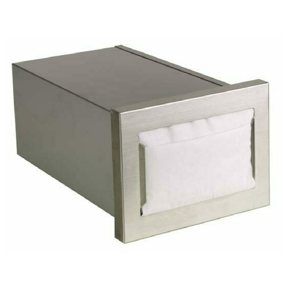 The Dispense-Rite CMND-1 Napkin Dispenser is a built-in, horizontal unit specifically designed for efficient napkin storage and dispensing in various food service settings. This dispenser is engineered to accommodate napkins measuring between 4-1/2" to 5" by 6-1/2", making it versatile for establishments requiring specific napkin dimensions. The unit's overall dimensions are 6-1/8" in height, 8-1/8" in width, and 12-7/8" in depth, ensuring a compact yet practical fit for counter spaces. It features a 5-1/4" by 7" cut-out, facilitating easy installation and integration into existing cabinetry. Constructed from high-quality stainless steel, the CMND-1 is designed for durability, providing a long-lasting solution that withstands the demands of high-traffic environments. Its robust build ensures it remains a reliable fixture in any commercial kitchen or dining area. This napkin dispenser meets the needs of diverse market segments within the food service industry, from fast-food chains to upscale dining establishments, by offering a sleek and efficient napkin dispensing solution. The Dispense-Rite CMND-1 Napkin Dispenser combines functional design with superior material quality, catering to both the aesthetic and operational demands of modern food service facilities.