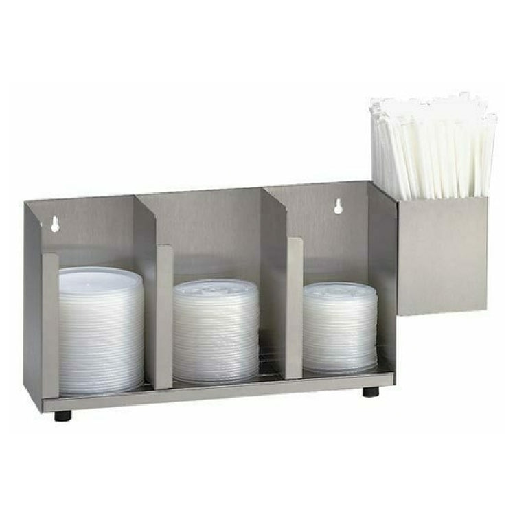 The Dispense-Rite CTLD-15A Lid-Cup Organizer is a versatile and efficient storage solution designed for a variety of commercial environments. This organizer features an adjustable configuration, allowing for customized storage across its three sections. Measuring 8 inches high, 19-5/8 inches wide, and 5 inches deep, it provides ample space while maintaining a compact footprint suitable for counters or workstations. Constructed from durable stainless steel, the CTLD-15A ensures longevity and resistance to wear in high-use settings, making it a reliable choice for food service establishments. This product includes the innovative SH-1 straw attachment, adding an additional layer of functionality by accommodating straw storage alongside lids and cups. Its robust construction and adaptable design cater to the needs of fast-paced environments like cafes, restaurants, and self-service stations, where organized and efficient dispensing is crucial. The Dispense-Rite CTLD-15A Lid-Cup Organizer's blend of durability, adjustability, and added straw storage feature make it a valuable asset in maintaining streamlined operations and enhancing the customer experience in diverse food service applications.