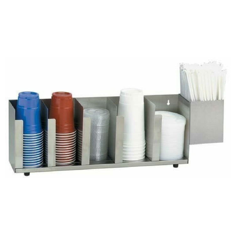 The Dispense-Rite CTLD-22A Lid-Cup Organizer Adjustable 5 Section is a versatile solution engineered to meet the dynamic needs of the beverage service industry. Featuring a compact design with dimensions of 8 inches in height, 26-5/8 inches in width, and 5 inches in depth, this organizer efficiently utilizes space while maintaining accessibility and organization. Constructed from high-quality stainless steel, it offers durability and a sleek appearance, ideal for high-traffic environments where longevity and hygiene are paramount. The organizer includes five adjustable sections, making it adaptable to various cup and lid sizes, catering to diverse operational requirements. An added SH-1 straw attachment enhances its functionality, providing a comprehensive organizing solution for beverage service stations. This product's solid construction and thoughtful design make it a valuable asset across multiple segments within the food service industry, from fast food outlets and cafés to corporate kitchens, enabling streamlined service and a tidy, professional appearance. The Dispense-Rite CTLD-22A is particularly suited for businesses looking to optimize their drink service areas efficiently, ensuring quick access to cups, lids, and straws, thereby enhancing customer satisfaction and operational efficiency.