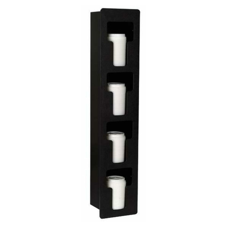 The Dispense-Rite FMVL-4 Lid Dispenser is a built-in unit thoughtfully designed for efficient organization and accessibility within professional settings. Featuring four distinct sections, this dispenser stands at 33-3/4 inches in height, with a width of 7 inches and a depth of 5-1/2 inches, making it a compact yet highly functional solution for lid storage. The precise cut-out dimensions of 32-3/8 inches by 5-5/8 inches ensure seamless integration into existing setups, optimizing space in various service environments. Constructed from durable black polystyrene, the FMVL-4 Lid Dispenser is crafted to withstand the demands of high-traffic use while maintaining a sleek, professional appearance. Ideal for use in restaurants, cafeterias, or any food service operation requiring quick and organized access to lids, this dispenser enhances workflow efficiency by keeping essentials within reach. Its robust and practical design makes it an indispensable tool for maintaining order in fast-paced settings, catering to the needs of businesses that prioritize both functionality and aesthetics in their operational tools.