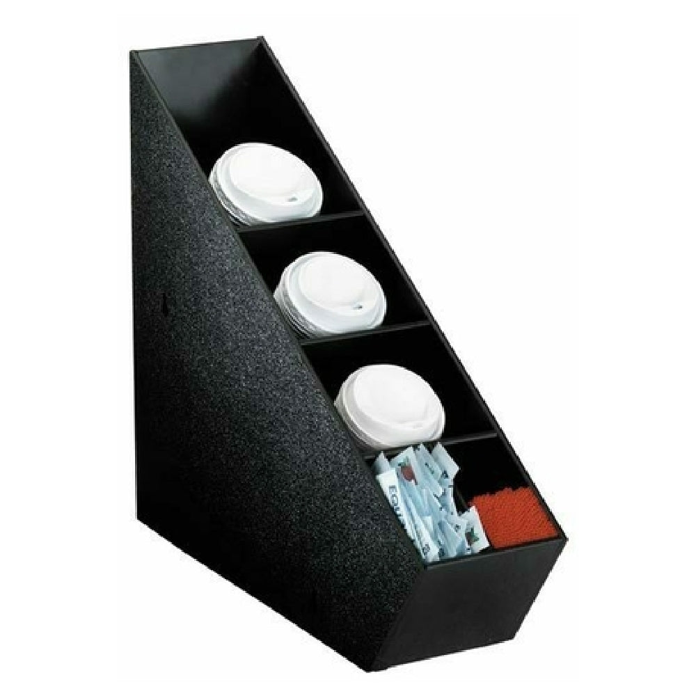 The Dispense Rite PL-CT-LID Lid Straw & Condiment Organizer Narrow is a compact and efficient solution for organization needs in various food service environments. Measuring 17-1/2 inches in height, 5-1/2 inches in width, and 19 inches in depth, this organizer is specifically designed to fit into narrow spaces without sacrificing functionality. Constructed from durable black polystyrene, it provides a robust and reliable option for organizing lids, straws, and condiments. Its sleek black finish offers a professional look suitable for both front-of-house and back-of-house applications. This product is particularly valuable for cafes, fast-food restaurants, and beverage stations where space optimization is crucial. The narrow design ensures it can be placed in tight areas, making the most of available space while maintaining a neat and organized appearance. Its construction material, polystyrene, is known for its strength and resistance to wear, ensuring longevity and ease of maintenance. As a versatile organizer, it supports efficient service operations by allowing quick access to essential items, thereby enhancing customer service and operational efficiency in busy service environments.