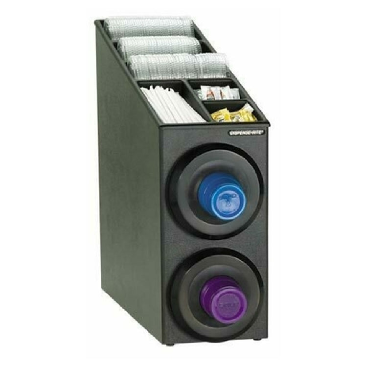 The Dispense Rite SLR-SL-2BT Cup Dispensing Cabinet is a versatile and efficient solution for organizing beverage service areas, offering robust features tailored for varied industry applications. Standing at 22-1/4 inches high, 8-1/2 inches wide, and 24 inches deep, this cabinet is engineered to maximize space and enhance operational flow. At its core, the SLR-SL-2BT is equipped with two SLR-2 stainless steel cup dispensers, accommodating cups ranging from 8 to 44 ounces in paper, plastic, or foam materials, with a rim diameter between 3 inches and 4-1/2 inches. This makes it an adaptable choice for businesses needing flexible cup storage options. The cabinet's interchangeable gasket design ensures a secure fit, reducing spillage and maintaining hygiene. Its ABS plastic top serves as a practical storage area for essential items like lids, straws, stir-sticks, and condiment packets, streamlining service and reducing clutter. Constructed from durable black polystyrene, the unit is both robust and lightweight, enhancing its longevity in high-use settings. The NSF-certified cup dispensers further affirm its compliance with the highest public health and sanitation standards, making it an ideal choice for food service businesses prioritizing efficiency and cleanliness.