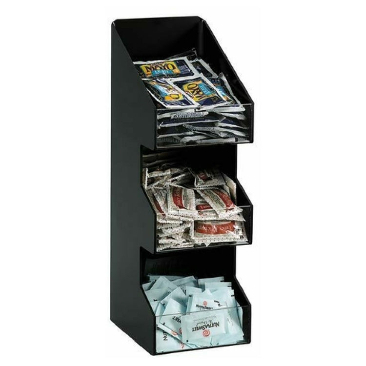 The Dispense-Rite VCO-3 Lid/Condiment Organizer is a practical countertop solution designed with three sections to streamline the organization of lids and condiments in various food service settings. This organizer measures 16 inches in height, 5-1/4 inches in width, and 6-5/8 inches in depth, providing a compact yet efficient option for maximizing space on countertops. Constructed from durable polystyrene, the VCO-3 is finished in black, offering both resilience and a sleek aesthetic that complements a wide range of commercial environments. Its multi-section design allows for categorization and easy access, enhancing workflow efficiency for staff and convenience for customers. The product is particularly suitable for fast-paced settings such as cafes, fast-food outlets, and self-service stations where quick retrieval and organization of lids and condiments are essential. The Dispense-Rite VCO-3 Lid/Condiment Organizer stands out for its sturdy construction and thoughtful design, making it a versatile asset for establishments aiming to maintain an orderly and professional presentation at their service counters. This organizer meets the demands of various market segments by offering a reliable solution for businesses looking to optimize their service areas without compromising on space or style.