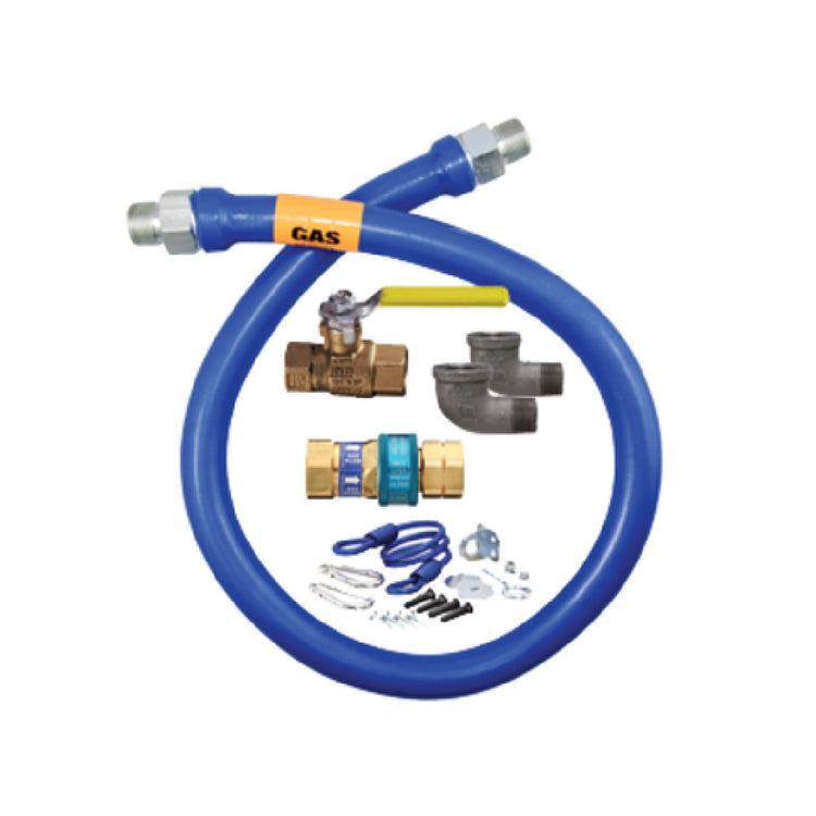 The Dormont 16100KIT24 Dormont Blue Hose™ Moveable Gas Connector Kit is a highly efficient solution designed to meet the demanding needs of various segments within the gas appliance industry. This kit features a 1-inch inside diameter and a 24-inch length, providing considerable flexibility for installation in diverse settings. Encased in a stainless steel braid and coated with blue antimicrobial PVC, the Dormont Blue Hose™ not only ensures durability but also enhances safety by preventing microbial growth. It is equipped with one SnapFast® Quick Disconnect (QD) and one full port valve, which facilitates quick installation and maintenance, reducing operational downtime. The inclusion of two 90° elbows further broadens installation possibilities, allowing for seamless integration into existing systems. Additionally, the coiled restraining cable with hardware offers added security, ensuring your gas connector remains firmly in place. With a substantial minimum flow capacity of 414,000 BTU/hr, this connector kit is well-suited to high-demand environments, supporting robust performance in commercial kitchens and other professional settings. The Dormont 16100KIT24 stands out as a reliable and versatile choice for professionals seeking a durable and efficient gas connection solution.