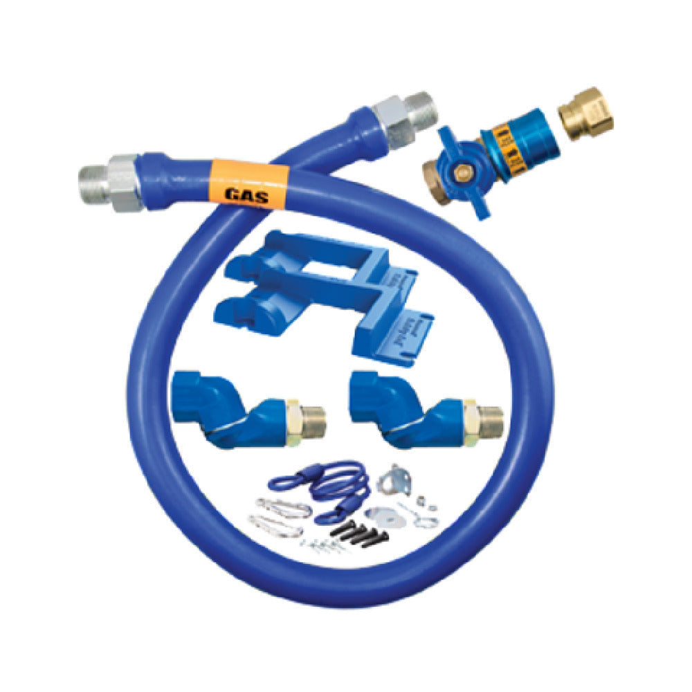 The Dormont 16100KITCF2S48PS Dormont Blue Hose™ Moveable Gas Connector Kit is a premium solution for ensuring secure and flexible gas connections in professional settings. With a 1-inch inside diameter and 48-inch length, this connector kit excels in providing ample reach and adaptability for a variety of kitchen configurations. Its construction includes a robust stainless steel braid covering, which is further enhanced by a blue antimicrobial PVC coating, combining durability with hygienic benefits. The kit is equipped with the Safety Quik® Quick Disconnect Valve (QDV) and two Swivel MAX® fittings, ensuring ease of use and safety during operation. Additionally, the inclusion of a Safety Set® with a hardware mounting option exemplifies its user-friendly installation process. The Dormont Blue Hose™ Connector Kit is designed with a limited lifetime warranty, highlighting its long-term reliability and performance. This product is ideal for commercial kitchen environments, offering a unique value proposition through its combination of flexibility, safety features, and durable construction. Whether in bustling restaurants or catering facilities, this connector kit supports seamless gas equipment mobility, catering to the high demands of various industry segments with precision and ease.
