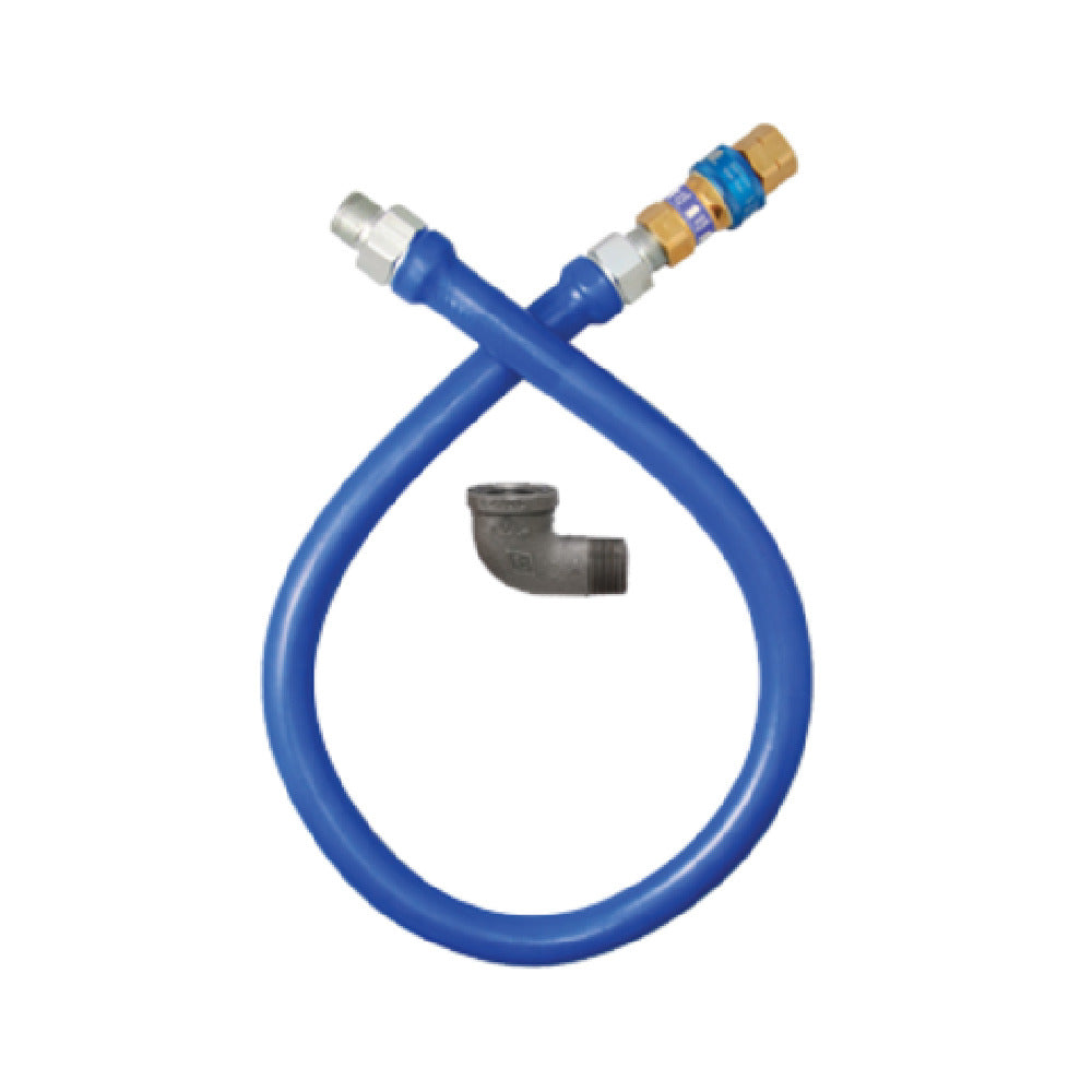 The Dormont 16125BPQ24 Dormont Blue Hose™ Moveable Gas Connector Hose Assembly stands out with its 1-1/4" inside diameter and 24" length, making it essential for dynamic gas connection needs in various industries. Engineered for durability, it is enveloped in a robust stainless steel braid, enhancing its resilience against wear and tear. The outer layer is coated with blue antimicrobial PVC, providing an added layer of protection against microbial growth, which is crucial for maintaining hygiene standards in environments like commercial kitchens and food service establishments. This gas connector hose assembly is equipped with a single SnapFast® QD connection and an elbow, ensuring easy installation and flexibility in tight spaces. With a minimum flow capacity of 699,000 BTU/hr, it efficiently supports high-demand gas-powered equipment, making it suitable for sectors that require reliable and high-capacity gas connections. A limited lifetime warranty underscores its quality and long-term reliability, positioning the Dormont 16125BPQ24 as a preferred choice for professionals seeking a durable and efficient gas connector solution.