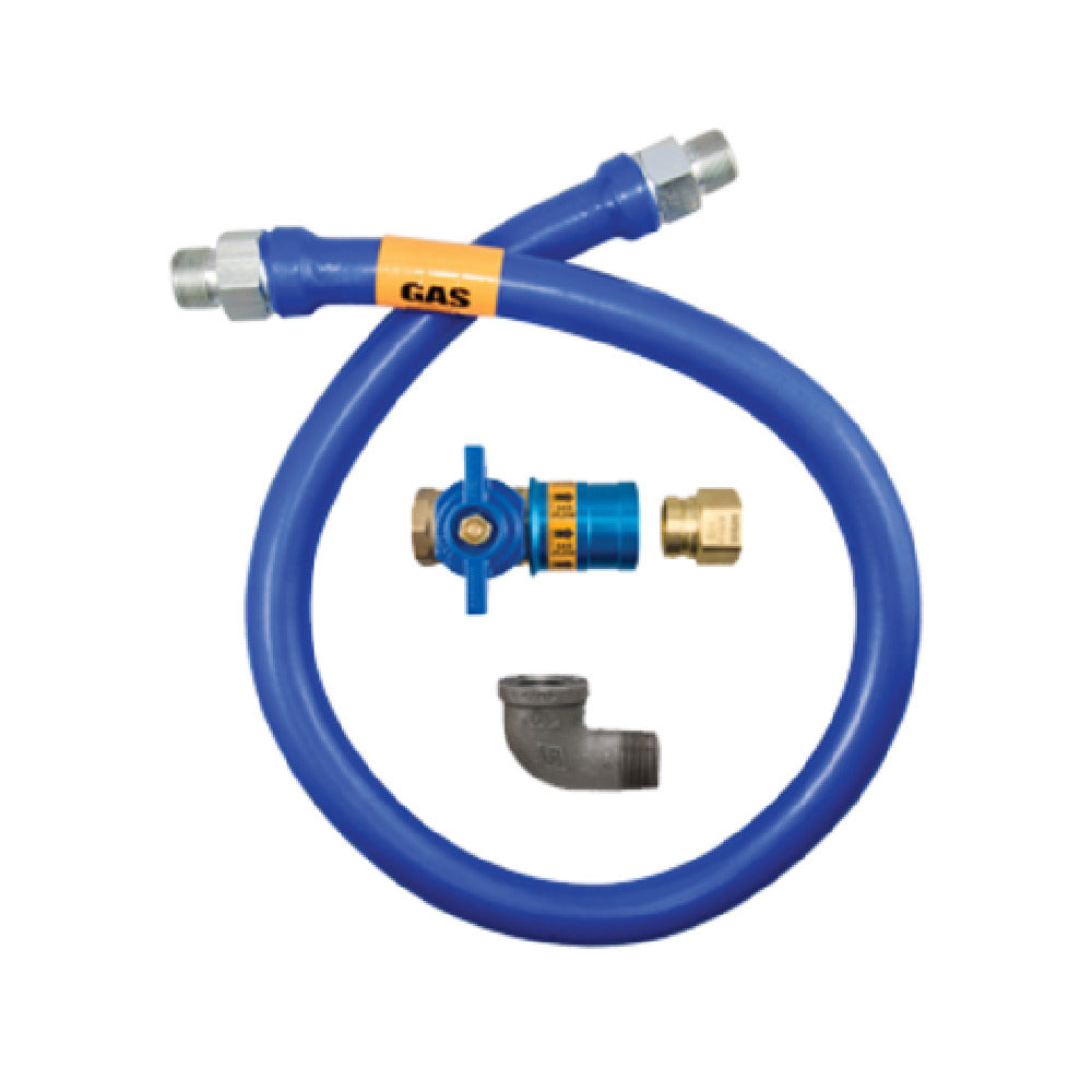 The Dormont 1650BPCF60 Dormont Blue Hose™ Moveable Gas Connector Hose Assembly is an essential component for any facility requiring flexible gas connections. With a 1/2 inch inside diameter and a 60-inch length, this hose assembly is designed to facilitate safe and efficient gas flow in various setups. Its stainless steel braid provides a robust protective layer, while the blue antimicrobial PVC coating ensures increased durability and hygiene—a crucial aspect for food service environments. This product features a Safety Quik® quick disconnect valve (QDV) and an elbow fitting, which simplifies installation and provides a secure connection. With a substantial flow capacity of 60,000 BTU/hr, it is well-suited for high-demand applications. The inclusion of a limited lifetime warranty underscores its reliability and long-term value, making it a wise investment for both commercial and residential settings. The Dormont 1650BPCF60's advanced design and sturdy construction meet the requirements of professionals seeking both performance and safety in gas connector systems.