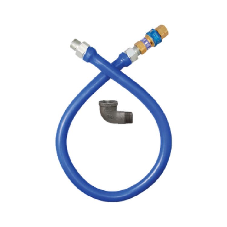 The Dormont 1650BPQ24 Dormont Blue Hose™ Moveable Gas Connector Hose Assembly 1/2" Inside Dia. is engineered for optimal performance and safety in gas appliance connections. Featuring a 1/2-inch inside diameter and a length of 24 inches, this hose assembly is meticulously crafted with a stainless steel braid, enhancing its durability and resistance to wear. The hose is coated with blue antimicrobial PVC, which not only provides an additional layer of protection against microbial growth but also ensures the hose remains flexible and easy to handle. It includes a SnapFast® Quick Disconnect (QD), facilitating swift and secure connections, and an elbow fitting to accommodate diverse installation requirements. With an impressive minimum flow capacity of 87,000 BTU/hr, this connector hose supports high-efficiency gas flow to a range of appliances, making it ideal for professional culinary environments as well as residential settings. The assembly is backed by a limited lifetime warranty, reflecting Dormont's commitment to quality and reliability. Whether for commercial kitchens or home use, the Dormont 1650BPQ24 offers a robust solution with features that cater to the needs of different market segments in the gas appliance industry.