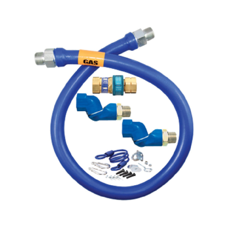 The Dormont 1650BPQ2SR24 Dormont Blue Hose™ Moveable Gas Connector Hose Assembly is engineered with precision to serve the unique demands of the gas appliance installation industry. This assembly stands out with a 1/2" inside diameter and a length of 24", providing a flexible yet robust connection for gas-powered equipment. It features a stainless steel braid cover that enhances durability while being coated with blue antimicrobial PVC, promoting hygiene and reducing bacterial growth. The assembly includes a SnapFast® quick disconnect for ease of use and two Swivel MAX® fittings that ensure smooth movement and prevent stress on the hose during appliance relocation. With a coiled restraining cable and hardware included, it offers added safety and stability. This hose assembly boasts a minimum flow capacity of 77,000 BTU/hr, making it suitable for a wide range of commercial applications. Furthermore, the product is backed by a limited lifetime warranty, underscoring its quality and reliability. The Dormont 1650BPQ2SR24 is an ideal choice for professional kitchens and foodservice establishments looking for a high-performance, safe, and long-lasting gas connector solution.