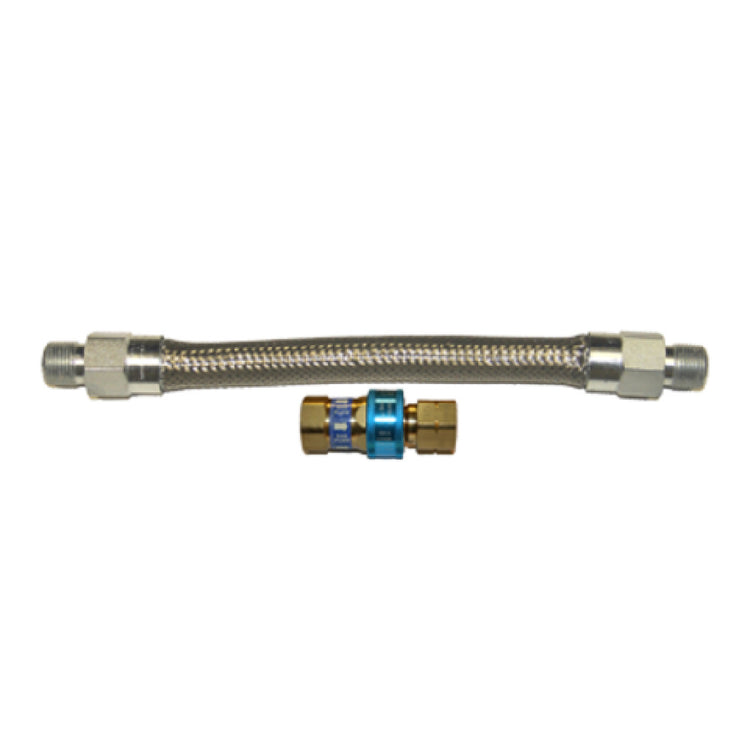 The Dormont 1650BQ24 Dormont Braided Gas Connector Hose Assembly - a reliable and robust choice for diverse gas connection needs. This assembly features a 1/2" inside diameter and a 24" length, making it suitable for a variety of installations. Its design includes a durable stainless steel braid that not only adds strength but also ensures longevity and safety in various environments. The assembly is equipped with a SnapFast® quick disconnect (QD) system, which facilitates easy and secure connection and disconnection, enhancing operational efficiency. Additionally, the inclusion of a 90° street elbow offers flexibility in tight installation spaces, making it adaptable to different configurations. This product comes with a limited lifetime warranty, underscoring its commitment to quality and customer satisfaction. The Dormont 1650BQ24 is an ideal choice for commercial kitchens, residential installations, and industrial applications, providing a dependable solution for seamless gas connectivity. Its unique design and high-quality materials make it a valuable asset in ensuring safe and efficient gas flow in any setup where it is utilized.
