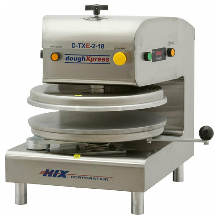 The DoughXpress D-TXE-2-18 (11225) Tortilla/Pizza Dough Press is an advanced electro-mechanical automatic machine designed to enhance efficiency in kitchens and bakeries. With an 18-inch diameter capability, this press features uncoated aluminum platens that heat up to 450°F, ensuring uniform cooking or pressing for tortillas and pizza doughs. The machine is equipped with digital timer and temperature controls, allowing precise adjustments for various recipes. Its infinite range thickness adjustment feature provides flexibility for chefs who require specific dough thicknesses. Safety is prioritized with two start buttons and an emergency stop button, providing users with control during operation. The stainless steel finish ensures durability and an easy-to-clean surface, making it suitable for high-demand environments. Operating on 220 volts, this machine consumes 3100 watts and requires a 15-amp circuit, using a NEMA 6-20P plug configuration. The DoughXpress D-TXE-2-18 is both cETLus and ETL-Sanitation certified, adhering to stringent safety and sanitation standards, and is proudly made in the USA. This product is ideal for businesses seeking reliable and versatile dough pressing solutions, offering a professional-grade option for various food service applications.