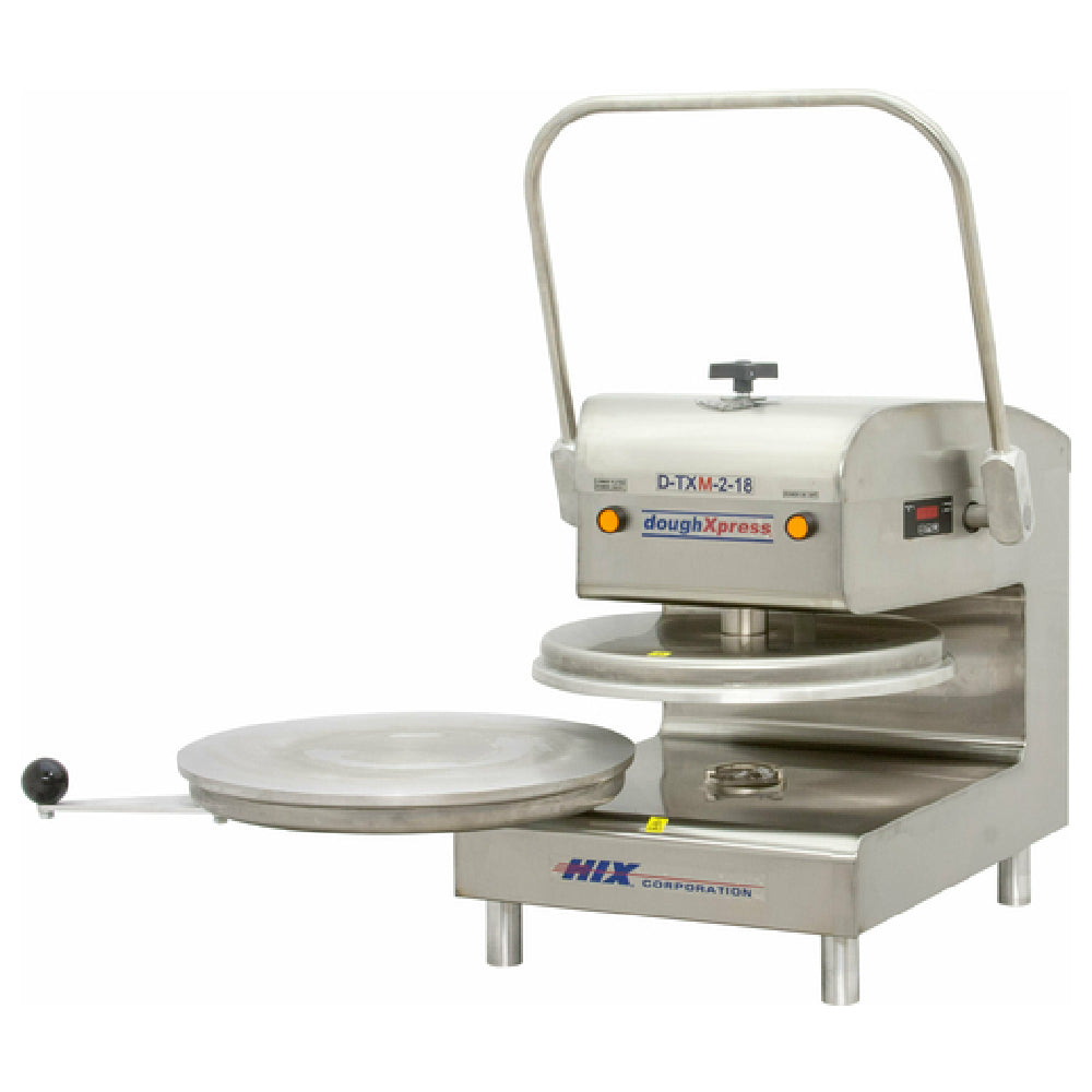 The DoughXpress D-TXM-2-18 (11216) Tortilla/Pizza Dough Press is a commercial manual machine engineered for precision and efficiency in producing tortillas and pizza bases. It features an 18-inch diameter, providing a substantial surface area suitable for various dough types. This model comes with uncoated aluminum platens, both of which can heat up to 450°F, allowing for consistent temperature control during dough pressing. The digital timer and temperature controls offer precise adjustments, enhancing the reliability of the dough pressing process. Additionally, the press includes an infinite range thickness adjustment mechanism, giving users the flexibility to achieve their desired dough thickness. The pull-down handle design ensures ease of use, while the illuminated power on/off button facilitates straightforward operation. With a sleek stainless steel finish, this machine is both durable and visually appealing. It operates on 220v/60/1-ph with a power of 3100 watts and a current of 15 amps, and it is equipped with a NEMA 6-20P plug for safe electrical connections. The DoughXpress D-TXM-2-18 is cETLus and ETL-Sanitation certified, emphasizing its commitment to safety and sanitation standards. Proudly made in the USA, this dough press is an ideal choice for various segments of the food service industry, including pizzerias and tortilla manufacturers.