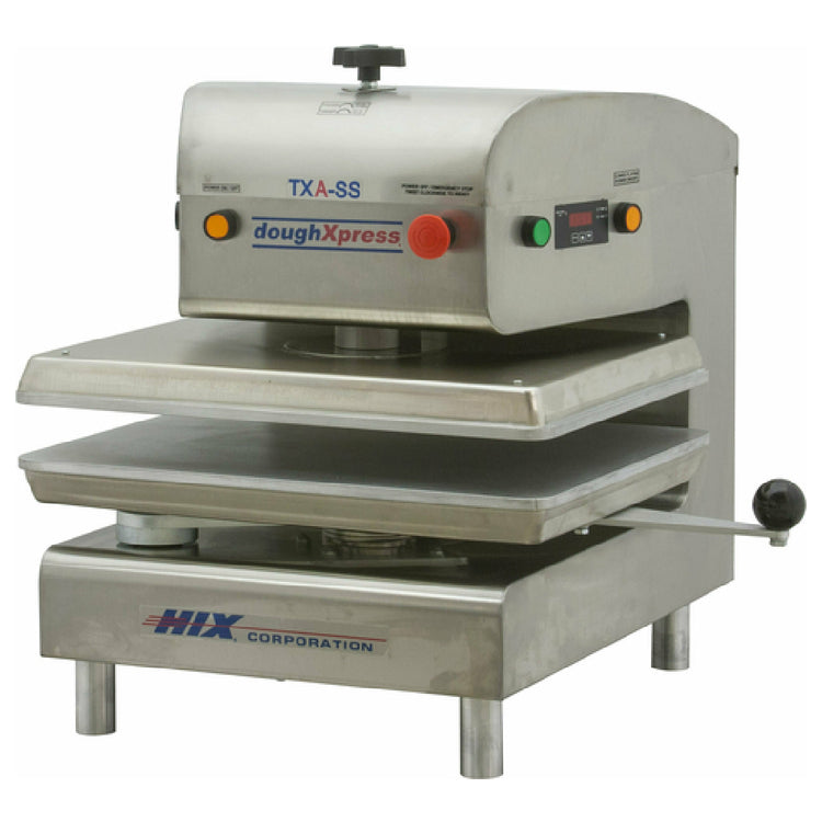 The DoughXpress TXA-SS (11237) Tortilla Dough Press - automatic swing-away design is a highly efficient machine engineered for high-volume tortilla production, making it suitable for both small and large-scale operations. Featuring two heated aluminum platens measuring 16" x 20", this press can produce between 600-800 tortillas per hour, ensuring swift and consistent results. The digital timer and temperature controls allow for precise adjustments, catering to different tortilla thickness requirements with a full range of thickness adjustment up to 7/8". Its design includes an illuminated power on/off switch and a heat indicator light, enhancing user convenience and operational safety. Constructed with a stainless steel exterior, the DoughXpress TXA-SS ensures durability and easy maintenance. The unit operates at 220v/60/1-ph, drawing 15.0 amps with a power output of 3.1kW, and is equipped with a NEMA 6-20P plug. Compliance with CE, cETLus, and ETL-Sanitation standards highlights its adherence to safety and sanitation guidelines, while being proudly made in the USA. Please note that an air compressor is required for operation. This dough press effectively meets the demands of foodservice providers, restaurants, and artisanal tortilla makers seeking a reliable and high-performance solution in their production processes.