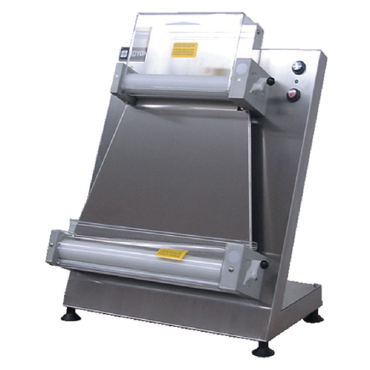 The Doyon DL18P Dough Sheeter Countertop Two (2) Sets Of Rollers is a highly efficient machine tailored for professional bakeries and pizzerias seeking precision and speed in dough preparation. With its dual sets of rollers, this sheeter processes up to 600 pieces per hour, making it a valuable tool for high-demand environments. The rollers are constructed of Teflon, ensuring smooth operation and reducing dough sticking. Its adjustable roller gap allows for customizable dough thickness, accommodating a variety of recipe requirements. The machine is built to handle dough sheets up to 18 inches wide, providing versatility for different dough types and sizes. Constructed with a robust stainless steel body and scraper, the DL18P ensures durability and easy maintenance. Powered by a 1/2 hp motor, this sheeter delivers consistent performance while maintaining energy efficiency. Certified by cETLus and ETL-Sanitation, it meets rigorous safety and sanitation standards, offering peace of mind in compliance with industry regulations. The Doyon DL18P Dough Sheeter's compact countertop design makes it an excellent choice for establishments with limited space, providing a combination of functionality and reliability in a compact form factor.