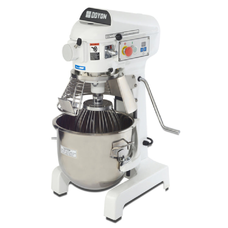 The Doyon SM200 (MIDDLEBY ESSENTIALS ITEM) Planetary Mixer Floor Model is a highly efficient and versatile piece of equipment designed for professional baking environments. With a 20-quart capacity, it caters to small to medium-scale production needs across various bakery segments. This mixer operates with a 3-speed, gear-driven motor, offering flexibility and precision for different mixing requirements. The manual bowl lift facilitates easy operation, while the integrated timer and emergency stop enhance safety and control. Crafted from durable cast iron with a white powder-coated finish, the mixer combines robustness with aesthetic appeal. It includes a range of essential accessories - a stainless steel bowl, safety guard with an integrated feed chute, dough hook, whip, and flat beater, enabling a wide variety of mixing tasks. Additionally, the #12 driven hub expands its functionality for attachments. Featuring a 1/2 HP motor, it runs on a 120v/60/1-ph power supply with a power consumption of 1.44 kW and 12.0 amps, and it is equipped with a NEMA 5-15P plug. Certified by NSF and cETLus, the Doyon SM200 ensures compliance with safety and efficiency standards, making it an indispensable tool for any bakery seeking reliability and excellence in mixing performance.