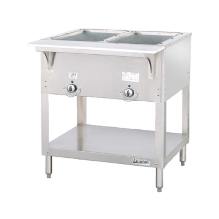 The Duke E302SW_208/60/3 Aerohot™ Hot Food Station Electric is a compact and efficient solution for food service establishments, boasting dimensions of 30-3/8"W x 22-7/16"D x 33-3/8"H. This electric hot food station features two 12" x 20" sealed hot food wells, each equipped with individual drains and valves, allowing for precise and efficient temperature management. The unit is fitted with infinite controls, enabling tailored heating settings to suit various culinary requirements. Its stainless steel top is complemented by a 1/2" thick x 7" wide poly carving board, providing a durable and hygienic surface for food preparation. The open base design, constructed of stainless steel, includes an undershelf for additional storage, while the sturdy legs and feet ensure stability. A 6' cord and plug facilitate convenient installation and mobility. Certified by cULus and UL EPH Classified, this hot food station meets stringent safety and sanitation standards. Designed for versatility, the Duke E302SW_208/60/3 is an exceptional choice for different market segments, such as catering services, buffets, and dining facilities, who require a reliable and efficient method to keep food warm and ready for serving.