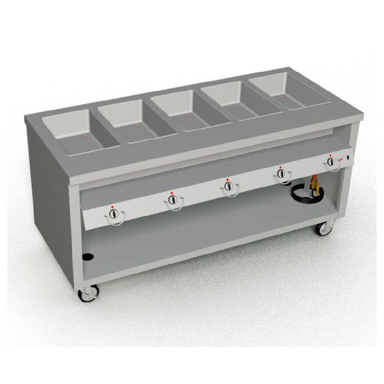 The Duke TEHF-74PG_217107 Thurmaduke™ Hot Food Unit Mobile Electric is a state-of-the-art solution designed for the dynamic demands of the food service industry. Measuring 74 inches in width, 32 inches in depth, and 36 inches in height, this robust unit features a 16-gauge stainless steel top that ensures durability and easy cleaning. Equipped with five stainless steel heat wells, each with individual drains and copper manifolds, this unit facilitates optimal temperature control, supported by integrated thermostats. The inclusion of a dish shelf and a 20-gauge paint grip steel body with an undershelf underline its practicality and storage capability. For mobility, the unit includes 5-inch swivel casters with brakes, allowing for seamless movement within various service environments. The 6-foot cord with plug enhances its operational convenience, while its compliance with cULus and UL EPH classifications underscores its adherence to safety and performance standards. Whether for catering, institutional dining, or restaurant use, the Duke TEHF-74PG_217107 is engineered to deliver reliable and efficient hot food service in any setting.