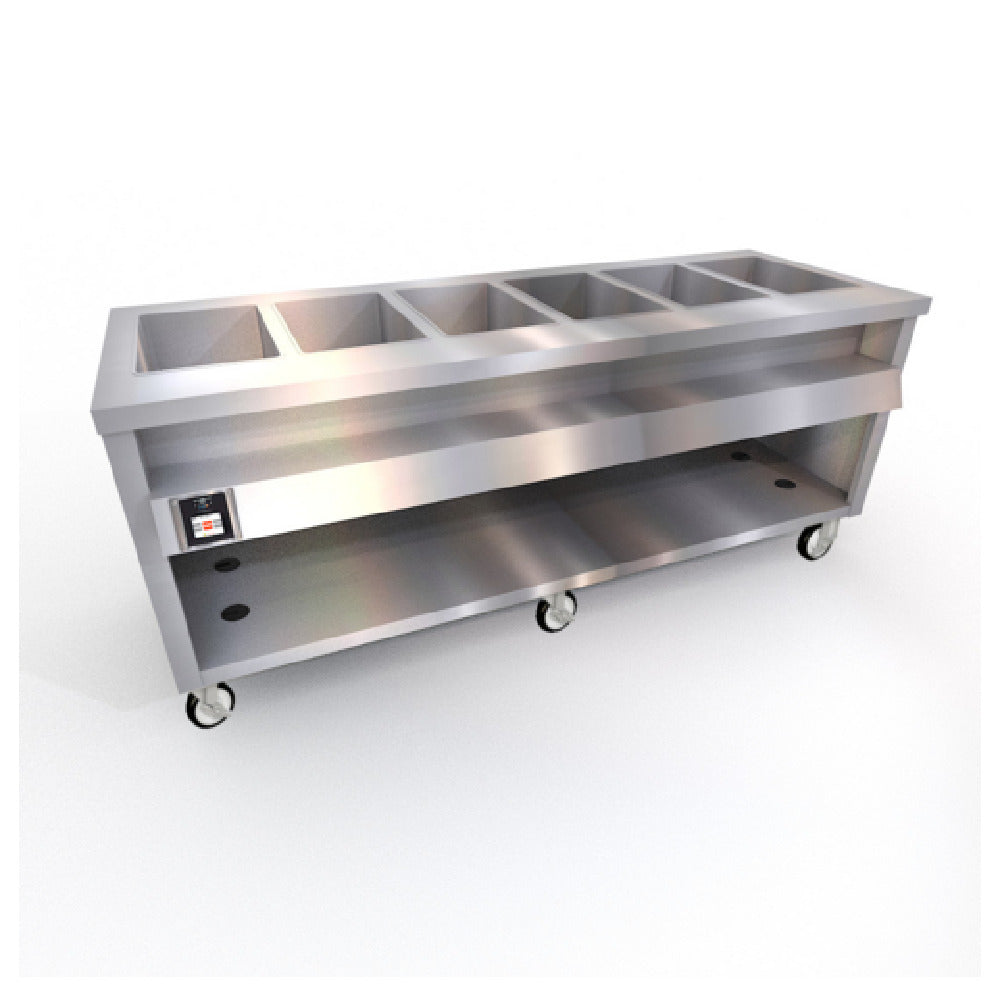 The Duke TWHF-88PG Thurmaduke™ Ganged Waterless Well Mobile Electric unit is a sophisticated piece of equipment meticulously engineered for efficiency in food service environments. With dimensions of 88"W x 32"D x 36"H, it features a 16-gauge stainless steel top that ensures durability and ease of cleaning. This mobile electric unit is equipped with six stainless steel heat wells, facilitating excellent heat retention and distribution for seamless food warming capabilities. The advanced touch screen controls offer precision and ease of use, catering to the dynamic needs of professional kitchens. Built with a paint grip steel body and undershelf, this unit provides durability and additional storage space. For mobility, it incorporates 5" diameter swivel casters with brakes, enabling easy maneuverability and secure positioning in bustling kitchen settings. The Duke TWHF-88PG includes a 6' cord and plug for convenient electrical connectivity and is cULus and UL EPH Classified, underscoring its adherence to stringent safety and health standards. This versatile model is tailored for various market segments, offering a reliable and efficient solution for caterers, hotels, and other food service institutions looking to enhance their operational capabilities with a robust and technologically advanced heating unit.
