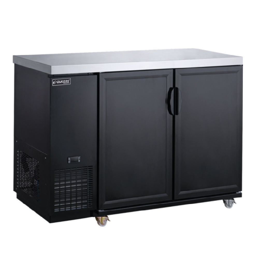 Dukers Appliance Co. USA Ltd. DBB48-M2 Refrigerated Back Bar Cooler Reach-in Two-section is a versatile and efficient solution for businesses in need of reliable beverage storage. This cooler features a substantial width of 49-7/8 inches, optimizing space for a variety of storage applications. Equipped with self-contained side mount refrigeration, it offers efficient cooling with a digital temperature control range from 33°F (0.5°C) to 38°F (3.3°C). The automatic defrost function ensures minimal maintenance, while the unit's R290 refrigerant and 1/5 HP motor provide environmentally friendly and powerful performance. Inside, the cooler includes two lockable hinged solid doors and four adjustable shelves, enhancing security and flexibility in storing different products. The interior LED light with a switch provides excellent visibility, and the stainless steel interior coupled with a black exterior lends a sleek, professional look. Additionally, the adjustable feet allow for stable positioning in various environments. Operating at 115v/60/1-ph with a NEMA 5-15P plug and drawing 2.66 amps, this cooler is cETLus and ETL-Sanitation certified, ensuring it meets rigorous safety and sanitation standards. This makes the DBB48-M2 an ideal choice for bars, restaurants, and commercial establishments requiring dependable refrigerated storage.