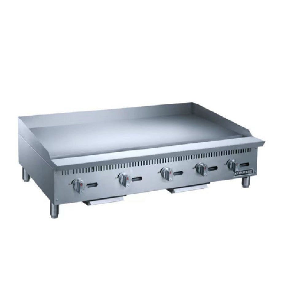 The Dukers Appliance Co. USA Ltd. DCGM60 Griddle is a gas-powered, countertop unit engineered for culinary professionals who demand efficiency and precision. With a width of 60 inches and a smooth, polished steel griddle surface that is 3/4 inches thick, this griddle ensures even heat distribution and a robust cooking platform. Equipped with five burners, each with independent manual controls spaced every 12 inches, this appliance allows for precise temperature adjustments across different sections of the cooking surface, catering to various cooking requirements simultaneously. The full-length seamless drop pan facilitates easy cleanup, enhancing operational efficiency in busy kitchen environments. Constructed with durable stainless steel, the griddle also features adjustable legs for stability on uneven surfaces. With a powerful output of 150,000 BTU, this unit is CSA-Sanitation and cCSAus certified, ensuring it meets rigorous safety and sanitation standards. Configured for natural gas with an included LP conversion kit, the Dukers DCGM60 Griddle is adaptable to different fuel sources, making it versatile for diverse food service settings. This griddle is an essential appliance for restaurants and catering businesses seeking a reliable, high-performance cooking solution.