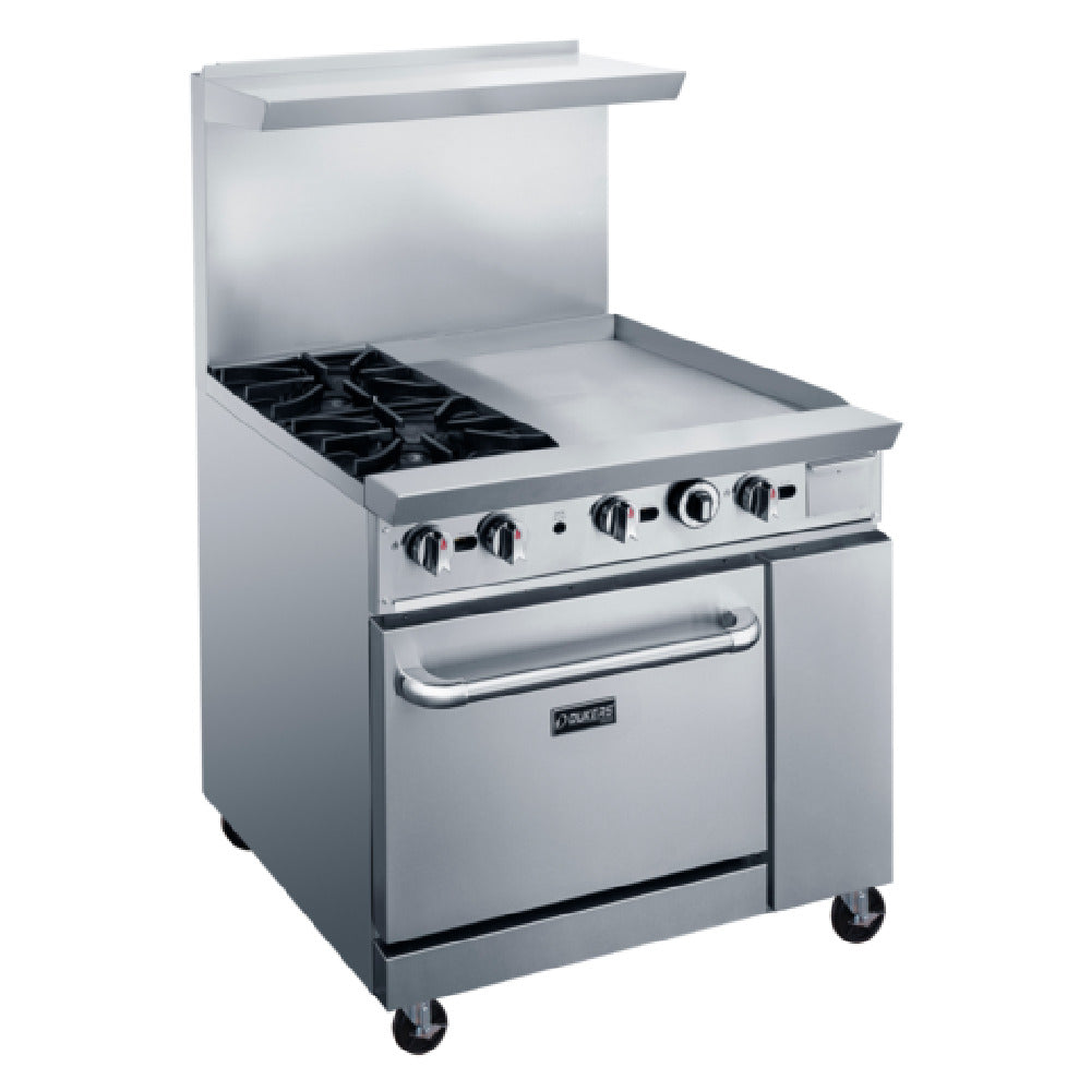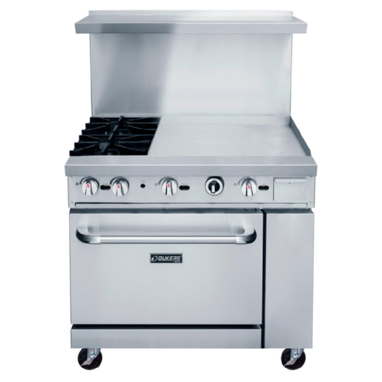 The Dukers Appliance Co. USA Ltd. DCR36-2B24GM Gas Range 36"W 2 Burner & 24" Griddle Top is a versatile kitchen appliance designed for commercial use, featuring a stainless steel exterior that includes the front, back sides, kick plate, back guard, and over shelf, ensuring durability and a sleek appearance. This gas range is equipped with two burners and a 24-inch griddle top, providing ample cooking space for various culinary applications. The 12" X 12" removable cast iron top grates offer ease of cleaning and maintenance, making it a practical choice for busy kitchens. The oven has an enamel interior, maintaining consistent quality over time, and offers a temperature range from 175°F to 500°F, catering to diverse cooking requirements. It includes a 3/4" NPT rear gas connection and is configured for Natural Gas, with an LP Conversion Kit included for flexibility in fuel options. The 6" casters ensure easy mobility, while the CSA-Sanitation and cCSAus certifications highlight its compliance with safety and sanitation standards. The Dukers DCR36-2B24GM Gas Range is an excellent solution for restaurant kitchens, providing reliable performance and adaptability to meet the dynamic needs of the food service industry.