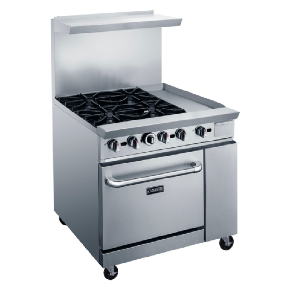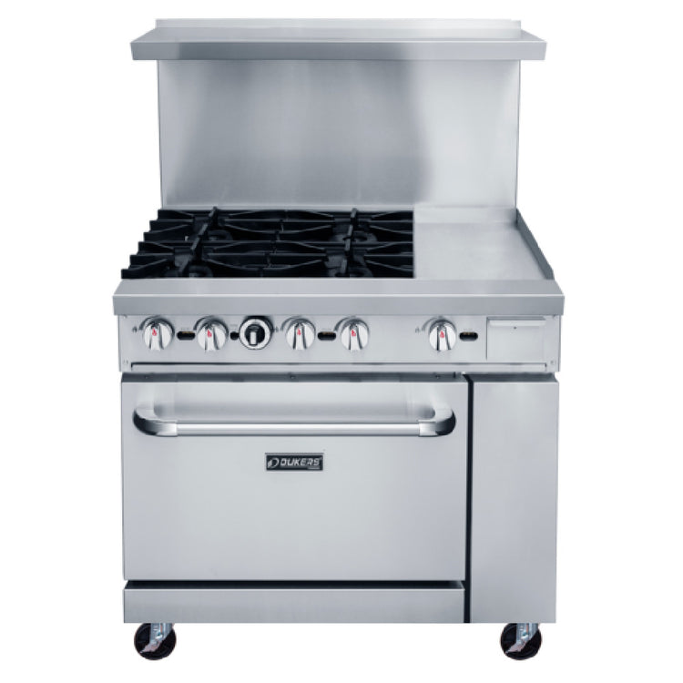 Dukers Appliance Co., USA Ltd., DCR36-4B12GM, Gas Range, 36"W, 4 burner & 12" griddle top, stainless steel exterior including front, back sides, kick plate, back guard and over shelf, 12” X 12” removable cast iron top grates, oven temperature range (175°F to 500°F), 3/4” NPT rear gas connection, enamel interior oven, 6" casters, CSA-Sanitation, cCSAus, (configured for Natural Gas, LP Conversion Kit included)
