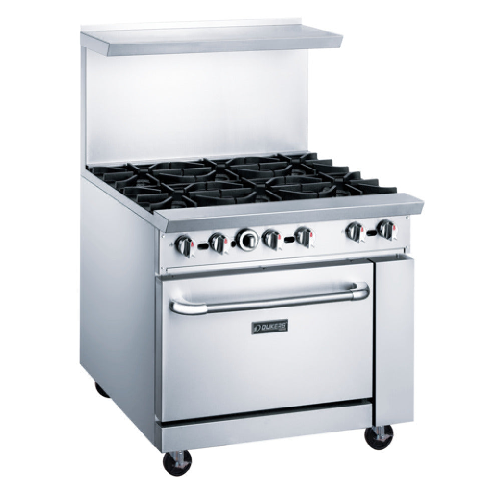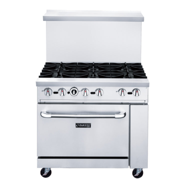 The Dukers Appliance Co. USA Ltd. DCR36-6B Gas Range is a high-performance cooking appliance precisely engineered for diverse culinary environments. With a width of 36 inches and equipped with six burners, this gas range is designed to meet the demands of commercial kitchens. Its stainless steel exterior, encompassing the front, back, sides, kick plate, back guard, and over shelf, ensures durability and an appealing aesthetic. Each burner is complemented by 12" x 12" removable cast iron top grates, facilitating straightforward cleaning and maintenance. The gas range features an oven with an enamel interior, providing a temperature range from 175°F to 500°F, suitable for various cooking requirements. A 3/4" NPT rear gas connection ensures efficient energy transfer and compatibility with standard kitchen setups. The inclusion of a 6" caster set offers mobility and ease of installation. Configured for natural gas, it also includes an LP conversion kit for versatility. Certified by CSA-Sanitation and cCSAus, this gas range meets rigorous sanitation and safety standards, making it an invaluable asset for restaurants, catering businesses, and other food service establishments seeking reliable, high-capacity cooking solutions.