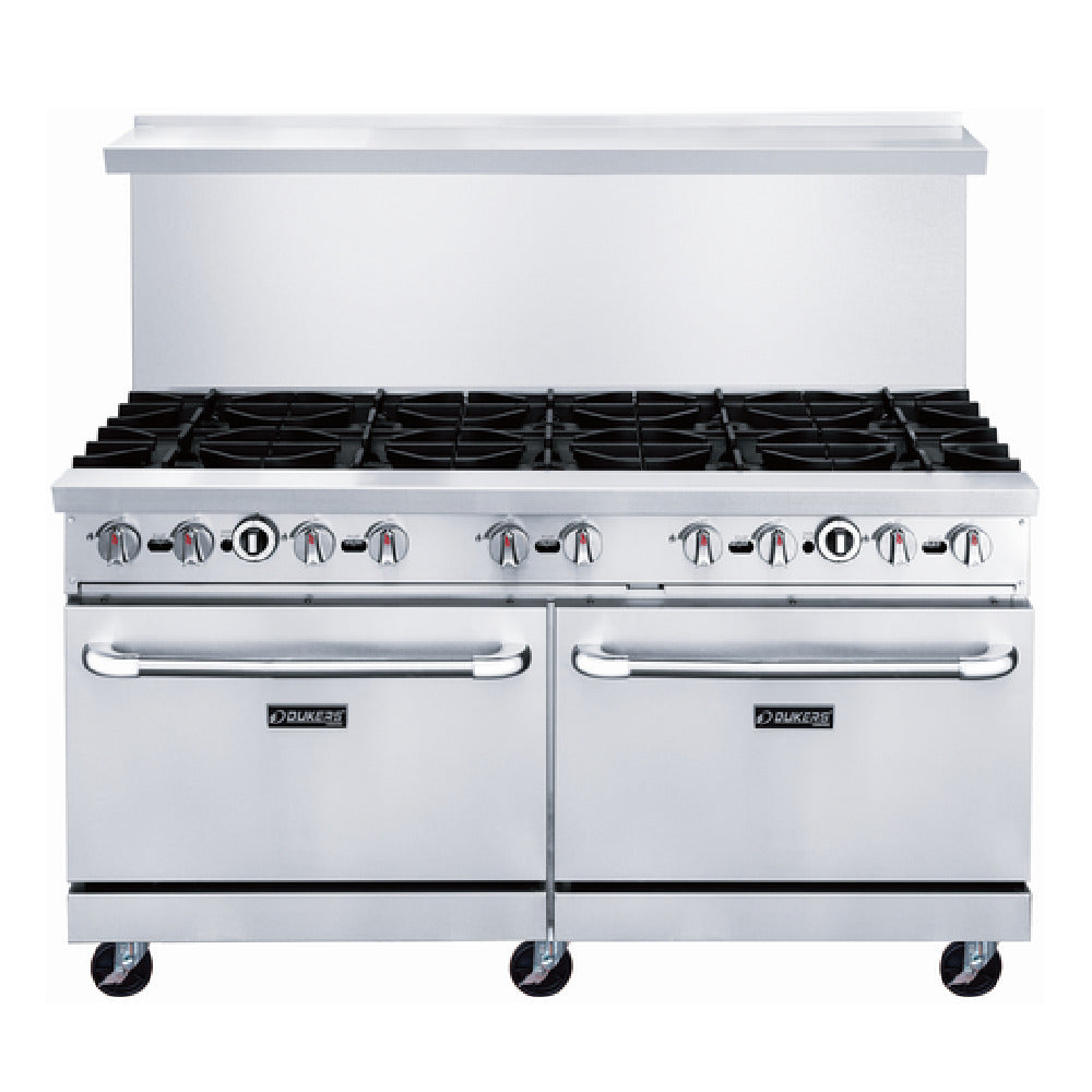 The Dukers Appliance Co. USA Ltd. DCR60-10B Gas Range is a high-performance cooking solution, designed for professional kitchens with varying demands. This gas range features a spacious 60-inch width and includes 10 burners, making it suitable for large-scale cooking operations. Its exterior is crafted from stainless steel, covering the front, back, sides, kick plate, back guard, and over shelf, ensuring durability and a sleek appearance. The range is equipped with 12-inch by 12-inch removable cast iron top grates, providing versatility and easy maintenance. The oven offers a broad temperature range from 175°F to 500°F, catering to diverse cooking requirements. Additionally, it has a 3/4-inch NPT rear gas connection, and the oven interior is lined with enamel for enhanced heat distribution. The unit stands on 6-inch casters, allowing for effortless mobility. It is CSA-Sanitation and cCSAus certified, affirming its compliance with industry standards. Configured for Natural Gas, it also includes an LP Conversion Kit, offering flexibility in fuel choice. The Dukers DCR60-10B is designed to meet the needs of culinary professionals seeking reliability, efficiency, and adaptability in a gas range, making it an essential addition to any commercial kitchen setting.