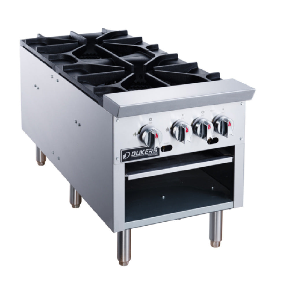 Dukers Appliance Co., USA Ltd., DCSPA2, Stock Pot Range, gas, 18"W x 42-1/4"D x 22-3/4"H, (2) heavy duty cast iron 3-ring burner, (2) continuous pilots, (2) manual controls for independent inner/outer rings, full length drip pan, stainless steel sides, front valve cover & legs, 160,000 BTU, cCSAus, CSA-Sanitation (Configured for Natural Gas, LP Conversion Kit Included)