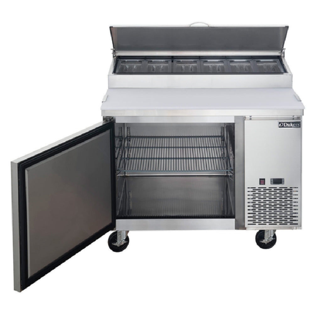 Dukers Appliance Co. USA Ltd. DPP44 Pizza Prep Table One-section 44"W is a versatile refrigeration solution tailored for the demanding environments of pizza kitchens and food preparation areas. This 44-inch wide prep table incorporates a self-contained side mount forced air refrigeration system, ensuring efficient cooling and consistent temperature maintenance. The digital temperature control allows for precise settings between 34°F (1°C) and 47°F (8°C), accommodating various storage needs. With an automatic defrost feature, maintenance is simplified, reducing downtime and ensuring consistent operation. The unit includes a self-closing solid door and an adjustable heavy-duty shelf, enhancing storage capabilities. Six 1/3 size pans are included, providing ample space for ingredient organization. Constructed with a stainless steel interior and exterior, the DPP44 ensures durability and ease of cleaning, ideal for high-traffic environments. Equipped with 5" casters, two of which are braked, this model offers mobility and stability. Utilizing R290 refrigerant, it meets eco-friendly standards while operating efficiently on a 110v/60/1-ph electrical requirement. The DPP44 is cETLus and ETL-Sanitation certified, underscoring its compliance with safety and sanitation standards. This prep table is a reliable and practical choice for food service professionals seeking quality and efficiency.