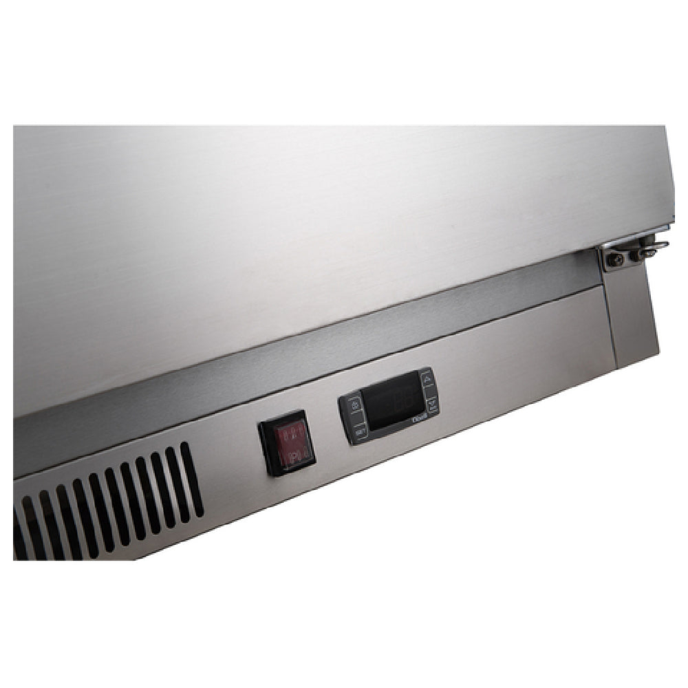 The Dukers Appliance Co. USA Ltd. DPP70 Pizza Prep Table Two-section 70"W is a robust refrigeration solution tailored for the foodservice industry. This unit boasts a self-contained side mount forced air refrigeration system, ensuring consistent cooling across its considerable space. The digital temperature control easily adjusts from 34°F (1°C) to 47°F (8°C), allowing precise temperature management for diverse culinary needs. It features automatic defrost, streamlining maintenance and ensuring optimal performance. The DPP70 comes with two solid self-closing doors and two adjustable shelves, offering versatile storage options. Included are nine 1/3 size pans, ideal for efficient food preparation and organization. Constructed with a stainless steel interior and exterior, the unit promises durability and ease of cleaning. Designed for mobility and stability, it is fitted with 5" casters, two of which are braked. Utilizing R290 refrigerant, this pizza prep table is both environmentally friendly and efficient. Operating at 110v/60/1-ph, it meets cETLus and ETL-Sanitation standards, ensuring compliance with safety and sanitation regulations. The Dukers DPP70 is an indispensable asset for pizzerias, restaurants, and catering services, providing reliable performance and versatility in food preparation environments.