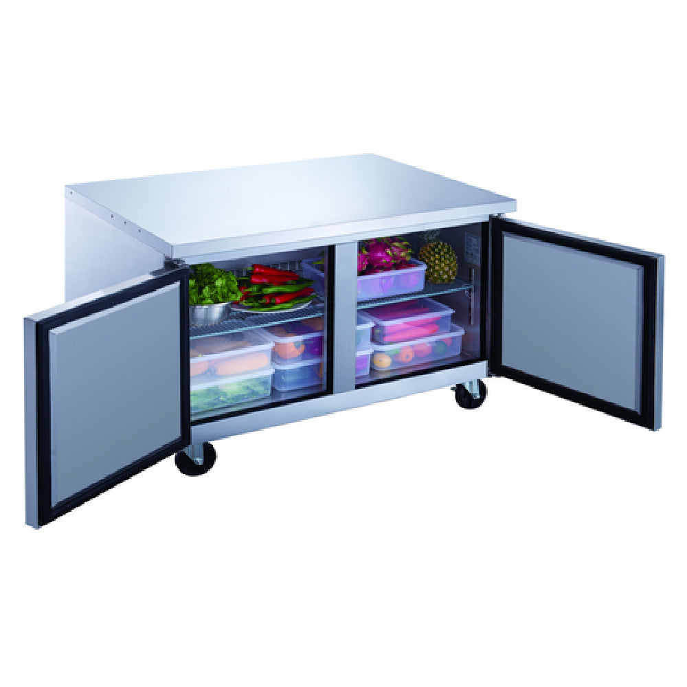 The Dukers Appliance Co. USA Ltd. DUC48F Undercounter Freezer Reach-in Two-section is an efficient cooling solution designed for professional kitchens and businesses needing accessible cold storage. With a width of 48 inches, this freezer features a bottom mount self-contained refrigeration system, offering reliability and ease of maintenance. The digital temperature control allows precise adjustments within the range of 0°F (-18°C) to -8°F (-22°C), ensuring optimal storage conditions for various frozen goods. Equipped with automatic defrost, the DUC48F minimizes manual upkeep, enhancing operational efficiency. The unit includes two solid self-closing doors and two adjustable shelves, maximizing storage flexibility and accessibility. Constructed with a stainless steel interior and exterior, it promises durability and easy cleaning, while the 5-inch casters—two of which are braked—facilitate effortless mobility and stability. Utilizing R290 refrigerant and powered by a 1/2 HP motor, the freezer operates on a 110v/60/1-ph electrical connection, certified by cETLus and ETL-Sanitation standards. This robust, versatile undercounter freezer serves a variety of market segments, from foodservice establishments to retail outlets, offering a reliable and space-efficient solution for maintaining frozen inventory.