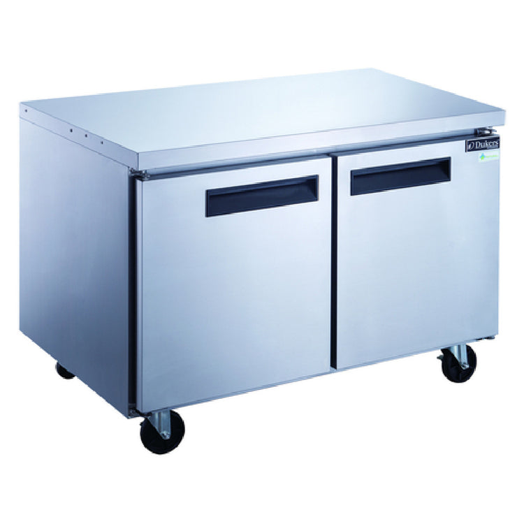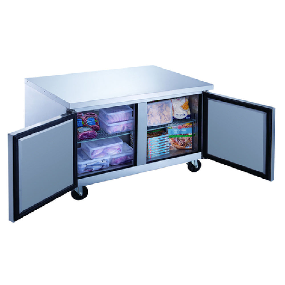 The Dukers Appliance Co. USA Ltd. DUC60F Undercounter Freezer Reach-in Two-section is a versatile and efficient refrigeration solution suitable for a variety of commercial environments. Measuring 60 inches wide, this undercounter freezer is designed for space-efficient storage with its reach-in, two-section configuration. It features a bottom-mounted self-contained refrigeration system, ensuring reliable cooling performance with a temperature range of 0°F (-18°C) to -8°F (-22°C). The DUC60F is equipped with digital temperature control, allowing precise temperature management for optimal storage conditions. Its automatic defrost function enhances ease of maintenance and operational efficiency. The freezer includes two solid self-closing doors and two adjustable shelves, offering flexible storage options. Constructed with a durable stainless steel interior and exterior, this unit promises long-lasting durability and easy cleaning. The freezer is fitted with 5-inch casters, including two with brakes, for smooth mobility and secure placement. Using R290 refrigerant and powered by a 1/2 HP motor with a 110v/60/1-ph electrical specification, the DUC60F complies with cETLus and ETL-Sanitation standards, emphasizing its commitment to safety and performance. This undercounter freezer is ideal for various market segments within the foodservice industry, offering reliable and efficient refrigeration for diverse needs.