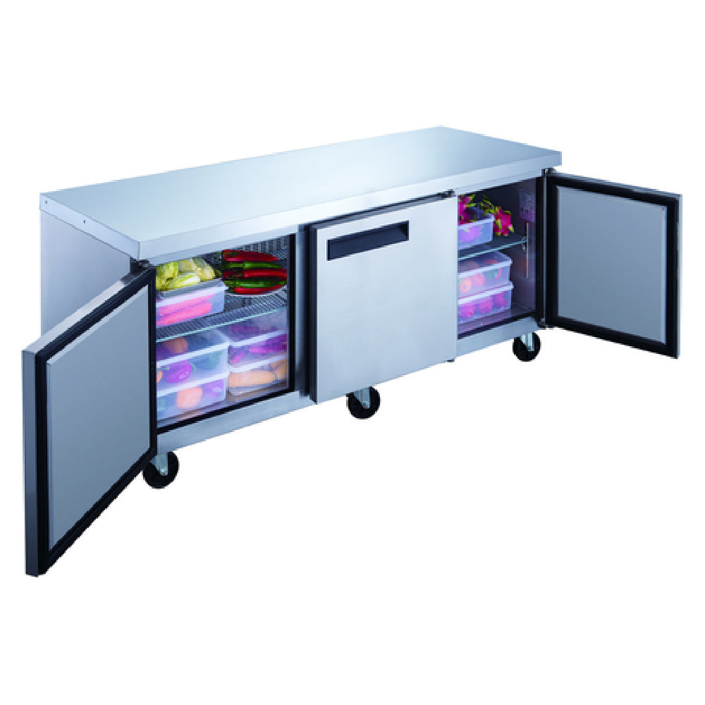 The Dukers Appliance Co. USA Ltd. DUC72R Undercounter Refrigerator Reach-in Three-section is a high-performance refrigeration unit designed to meet the diverse needs of commercial kitchens. It features a spacious 72-inch width and three sections, providing ample storage for various food items. The refrigerator is equipped with a rear-mounted self-contained refrigeration system and utilizes environmentally friendly R290 refrigerant, with a power output of 1/4 HP and operates on a 110v/60/1-ph electrical system. The digital temperature control maintains an optimal range of 33°F (0.5°C) to 41°F (5°C), ensuring food safety and freshness. Automatic defrost functionality enhances convenience and efficiency. The unit includes three solid self-closing doors and three adjustable shelves for customizable storage solutions. Constructed with a durable stainless steel interior and exterior, the refrigerator is designed for longevity and easy maintenance. It is mounted on 5-inch casters, two of which are braked, for mobility and stability. The DUC72R is cETLus and ETL-Sanitation certified, highlighting its compliance with safety and sanitation standards, and it holds an ENERGY STAR® rating for energy efficiency. This refrigerator is an ideal solution for restaurants, cafes, and catering businesses seeking reliable and efficient refrigeration solutions.