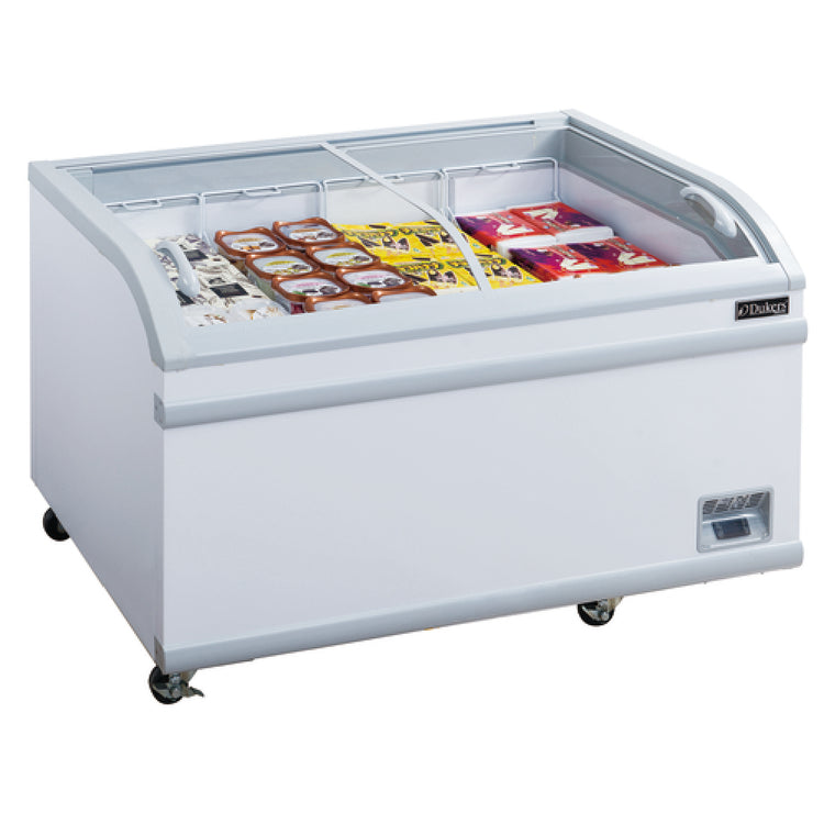 The Dukers Appliance Co. USA Ltd. WD-500Y Chest Freezer is an advanced refrigeration solution designed to meet the diverse needs of the food service industry. Measuring 56-5/8 inches in width, this freezer offers a generous 17.66 cubic feet capacity, making it an ideal choice for restaurants, supermarkets, and catering businesses that require substantial storage space. Utilizing a bottom mount self-contained refrigeration system, the WD-500Y ensures efficient cooling performance. It features two curved sliding glass lids, providing easy access while maintaining the internal temperature. The inclusion of four epoxy-coated baskets enhances organization within the freezer, allowing for efficient storage management. This model is equipped with analog temperature control, ensuring precise temperature settings, and an auto defrost feature to simplify maintenance. The WD-500Y's front bumper offers additional protection in busy environments. Constructed with a white interior and exterior, it integrates seamlessly into various commercial settings. Employing R290 Hydrocarbon refrigerant, this freezer prioritizes environmental sustainability. With a power consumption of 300 watts and electrical specifications of 115 volts, 60 hertz, single-phase, and 2.8 amps, it is compatible with NEMA 5-15P outlets. The WD-500Y is certified by cETLus and ETL-Sanitation, attesting to its compliance with safety and sanitation standards, making it a reliable asset for any professional kitchen.