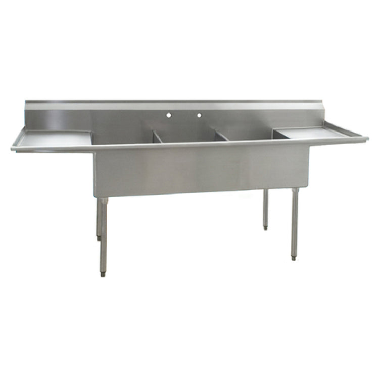 The Eagle 2472-3-24-16/4 Utility Sink is a versatile three-compartment unit designed for commercial environments requiring robust and efficient washing solutions. With an expansive width of 120-1/4 inches and a depth of 28 inches, this utility sink is constructed from 16-gauge, 430 stainless steel, ensuring durability and resistance to corrosion. Each compartment measures 24 inches by 24 inches and has a depth of 13-3/8 inches, offering ample space for washing tasks. The sink features an 8-inch high backsplash with a 1-inch upturn to prevent spills and splashes, maintaining cleanliness in your workspace. It is equipped with two sets of 8-inch on-center splash mount faucet holes, allowing for customizable faucet installation to suit different application needs. The utility sink includes 3-1/2 inch basket drains for efficient water drainage, while the 2-inch euro-style front edge and rolled side edges enhance safety and comfort during use. Supported by galvanized legs with adjustable plastic bullet feet, this utility sink offers stability and adaptability on uneven surfaces, making it an ideal choice for various industries including food service, hospitality, and manufacturing, where rigorous hygiene and functionality are paramount.