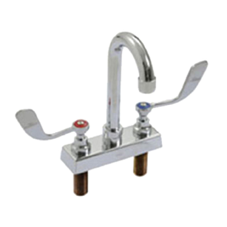 The Eagle 301005 Faucet - deck mounted 4" centers, features a rigid gooseneck nozzle, providing a sturdy and reliable water dispensing solution that caters to a variety of industry needs. This faucet is equipped with 4" wrist handles, allowing for effortless operation, particularly beneficial in settings where hygiene and ease of use are paramount, such as medical facilities and commercial kitchens. With its deck-mounted design, the Eagle 301005 ensures a solid and secure installation, enhancing its suitability for high-traffic environments. The 4" centers offer a standard fit, making this faucet compatible with a wide range of sink setups and simplifying installation processes. The rigid gooseneck nozzle not only adds to the aesthetic appeal but also provides precise water flow control, crucial for tasks demanding accuracy and efficiency. Constructed with durability in mind, this faucet is designed to withstand rigorous daily use, making it an ideal choice for sectors requiring dependable and long-lasting fixtures. Whether implemented in healthcare facilities or food service operations, the Eagle 301005 Faucet stands out for its combination of functionality, durability, and ease of use, effectively meeting the diverse demands of professional environments.