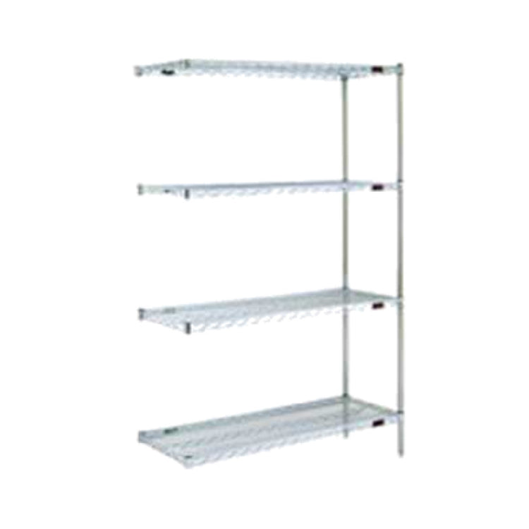 The Eagle A4-63-1848S Add-On Shelving Unit is a versatile 4-tier storage solution, measuring 48"W x 18"D x 63"H, designed to meet diverse organizational needs across various industries. Its wire shelves incorporate the patented QuadTruss® design, which enhances the unit's structural integrity and load-bearing capacity. This shelving unit features two 63"H posts that provide stable and secure support for the tiers. Additionally, each shelf is equipped with two "S" hooks, enabling seamless integration with existing shelving configurations or additional units. The shelving unit's stainless steel finish not only delivers a sleek, professional appearance but also offers superior resistance to corrosion, making it suitable for environments where hygiene and durability are paramount. The unit is supplied in a knockdown (KD) form, allowing for straightforward assembly and reconfiguration to accommodate evolving storage requirements. This add-on shelving solution is NSF certified, ensuring compliance with public health and safety standards, making it an ideal choice for industries such as food service, healthcare, and industrial storage where cleanliness and reliability are crucial. The Eagle A4-63-1848S Add-On Shelving Unit seamlessly blends functionality with robust design, making it a valuable investment for efficient space utilization and organization.