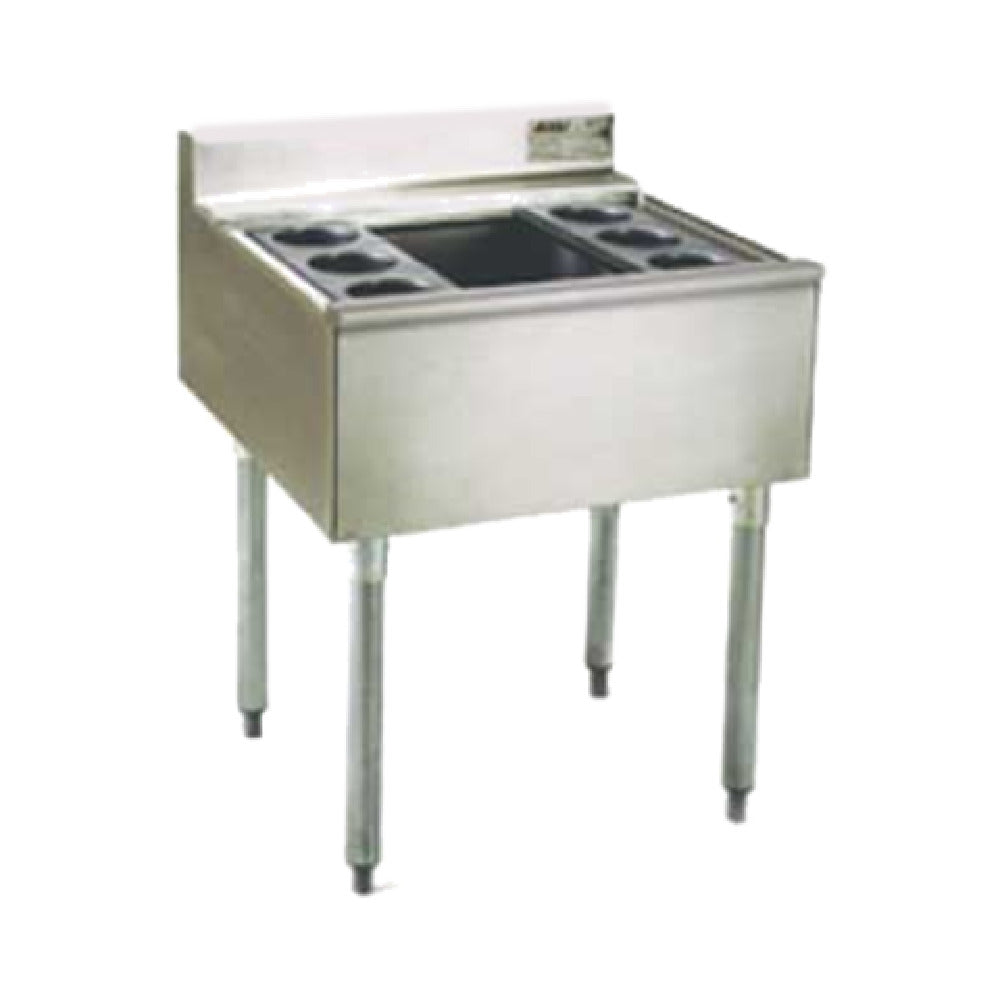 The Eagle B2CT-22-7 2200 Series Underbar Cocktail Unit Modular with 7-circuit Cold Plate is a highly specialized piece of equipment designed for commercial bar settings. With dimensions of 24 inches wide, 24 inches deep, and 33-1/2 inches high, this unit boasts a 63-pound capacity, making it a compact yet efficient solution for cocktail preparation. The unit's top and front are constructed from 22/304 stainless steel, offering durability and resistance to corrosion, while the back and sides are galvanized for additional strength. It features a 4-1/2 inch backsplash and a bullnose front edge, ensuring spills are minimized and the workspace remains clean. The fully insulated ice bin, 8 inches deep, includes six bottle wells, providing ample storage for chilled ingredients. The 1-5/8 inch diameter galvanized tubular legs with adjustable plastic bullet feet offer stability and adaptability to uneven surfaces. The inclusion of a 7-circuit cold plate ensures that beverages are kept at optimal temperatures, enhancing the efficiency of service in high-demand environments. Certified by NSF, this unit meets rigorous public health and safety standards, making it a reliable choice for bars and restaurants seeking to optimize their cocktail service capabilities.