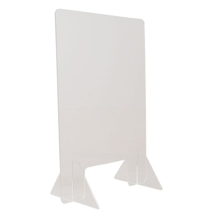 The Eagle BGFC-3024 Breath Shield Freestanding Countertop Model is a meticulously designed protective barrier, measuring 24 inches in width and 30 inches in height. This product is crafted from 7/32-inch thick plexiglass, ensuring both durability and clarity. It features two 8-inch by 14-inch interlocking stands, which provide stability without the need for tools during assembly. The design allows for the breath shield to be easily knocked down for storage, making it a convenient choice for businesses that require flexible protective solutions. Packaged in sets of four, the Eagle BGFC-3024 is ideal for a variety of industry segments, including retail, hospitality, and health services. This model facilitates a safer interaction environment by acting as a barrier against airborne particles, while its freestanding nature means it can be placed on any countertop without permanent installation. The combination of its robust construction and easy-to-assemble design makes it an essential asset for businesses focused on maintaining high safety standards while ensuring customer and employee comfort.