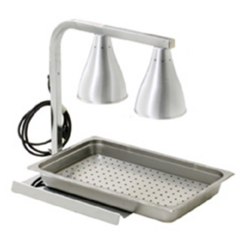 The Eagle BW-2-120I RedHots® Heat Lamp Portable 2 Bulb C-frame is a versatile and efficient solution for maintaining the perfect temperature of a variety of foods across different segments of the food service industry. This portable heat lamp features a C-frame design that houses two bulbs, providing ample coverage to keep food warm and appetizing. The frame boasts a heavy-gauge steel construction with a chrome-plated finish, ensuring both durability and an attractive appearance. The unit includes an adjustable height feature, allowing for flexibility in accommodating different types of food setups. Additionally, the stainless steel pan and drain insert offer a practical and easy-to-clean solution for everyday use. Operating at 120 volts with 500 watts of power and drawing 4.2 amps, this heat lamp is energy-efficient and suitable for continuous use in demanding environments. The Eagle BW-2-120I also comes equipped with a cord and plug for straightforward installation and operation. Certified by UL and NSF, this product meets high standards of safety and sanitation, making it an ideal choice for commercial kitchens, catering services, and buffet settings that require reliable and consistent food warming capabilities.