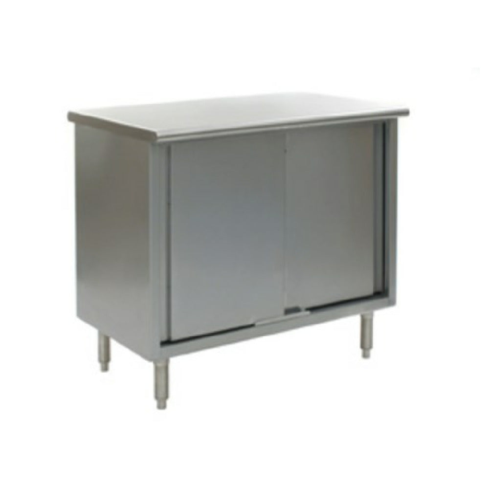 The Eagle CB3072SE Spec-Master® Series Work Table Cabinet Base With Sliding Doors is an expertly crafted piece of equipment designed to meet the diverse needs of the foodservice industry. This robust work table features a spacious 72"W x 30"D surface, supported by a durable 14/304 stainless steel top that offers exceptional resistance to corrosion, ensuring longevity and reliability in demanding environments. Its design includes rolled edges on both the front and back, enhancing safety and ease of use. The cabinet base is fitted with two sliding doors, allowing for efficient use of space and easy access to stored items. The inclusion of the Uni-Lok® gusset system fortifies its structural integrity, making it a dependable choice for high-traffic kitchens. Constructed with a stainless steel cabinet body, it is equipped with four sturdy legs and adjustable bullet feet, providing stability on uneven surfaces and facilitating versatile placement options. This product is NSF certified, highlighting its compliance with strict public health and safety standards. The Eagle CB3072SE work table is an invaluable asset for commercial kitchens, offering a unique combination of ample workspace, secure storage, and exceptional durability tailored to meet the rigorous demands of the foodservice sector.