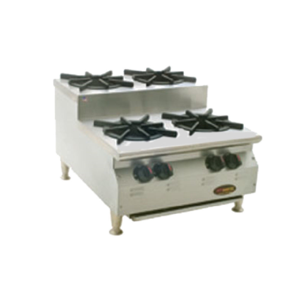 The Eagle CLUHP-4-NG-X RedHots® Chef's Line® Step-up Hotplate Counter Unit is a high-performance gas-powered cooking appliance designed for efficiency and versatility in professional kitchens. With a compact width of 24 inches, this unit is equipped with a powerful combination of two 25,000 BTU star burners and two 25,000 BTU step-up star burners, delivering a total of 100,000 BTUs. This feature provides precise and robust heat for a variety of cooking tasks. The hotplate boasts heavy-duty cast iron grates, ensuring durability and even heat distribution. Operators can easily manage the cooking process with 45-degree angled manual controls, enhancing user convenience. The unit includes a full-size polished stainless steel drip pan, facilitating easy cleaning and maintenance, while its aluminized steel base adds stability and longevity. Designed with safety and stability in mind, the hotplate comes with 4-5 inch adjustable cast metal legs featuring flanged feet. The bullnosed edge adds a sleek finish to the unit's design. Certified by NSF and cULus, this hotplate meets high standards for safety and sanitation, making it a reliable choice for a wide range of culinary applications in the foodservice industry.