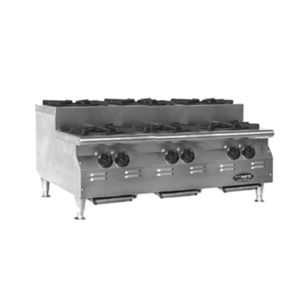 The Eagle CLUHP-6-NG-X RedHots® Chef's Line® Step-UP Hotplate Counter Unit is a gas-powered culinary asset designed for efficiency and versatility in professional kitchens. Measuring 36 inches in width, this unit is equipped with six powerful burners—three 25,000 BTU star burners and three additional 25,000 BTU step-up star burners—delivering a total output of 150,000 BTU. This configuration allows chefs to handle a variety of cooking tasks simultaneously, enhancing productivity. The hotplate features heavy-duty cast iron grates, known for their durability and even heat distribution, essential for precise cooking. Its design includes 45-degree angled manual controls for ergonomic operation, while a full-size polished stainless steel drip pan facilitates easy cleaning and maintenance. The unit's base is constructed from aluminized steel, offering robust support, and its bullnosed edge adds an element of safety by reducing sharp corners. Stability is ensured with 4-5 inch adjustable cast metal legs equipped with flanged feet. Certified by NSF and cULus, the Eagle CLUHP-6-NG-X adheres to stringent safety and sanitation standards, making it an ideal choice for various segments within the food service industry, from high-demand restaurants to catering enterprises seeking reliable and efficient cooking solutions.