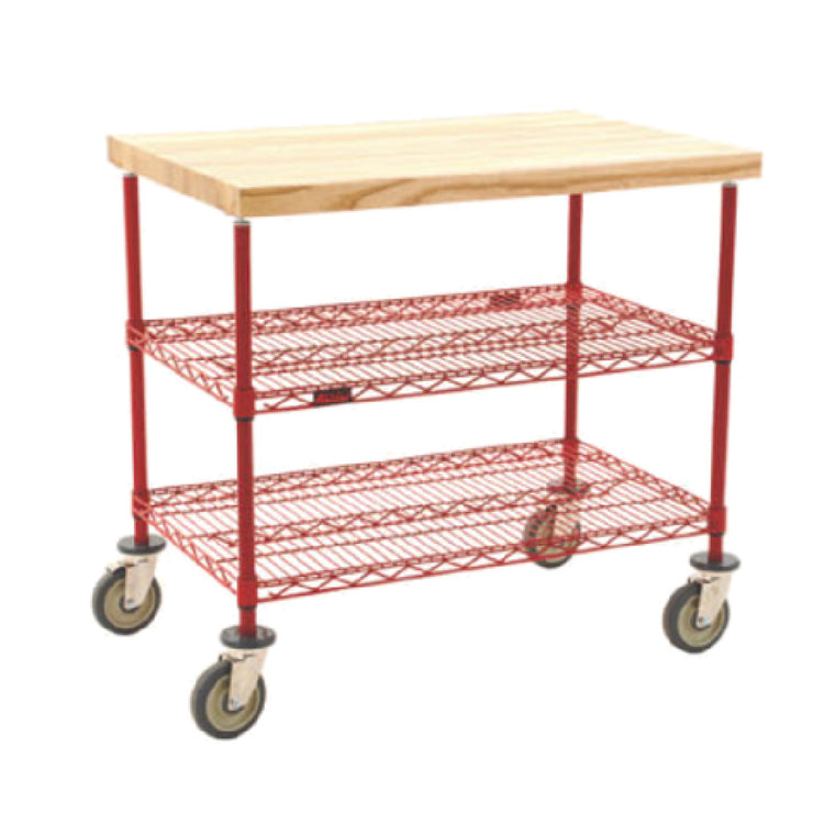 The Eagle DC2436R Maple Top Demo Cart 3-tier 36"W x 24"D x 34"H is a versatile and robust unit designed with practicality and durability in mind, making it suitable for a broad range of industry applications. This demo cart features a 1-3/4" thick hardwood butcher block top, providing a sturdy and reliable surface for various tasks. It includes two wire shelves constructed with the patented QuadTruss design, enhancing the shelves' strength and stability, which is vital for securely holding equipment or materials. The red epoxy finish adds both a visually appealing touch and a layer of protection against wear and corrosion. Equipped with 5" swivel decorative casters with donut bumpers, this cart ensures smooth mobility, allowing for easy transport across different areas while minimizing potential damage to walls and furniture. The Eagle DC2436R is NSF certified, ensuring compliance with public health and safety standards, making it an excellent choice for food service, education, or laboratory settings where hygiene and safety are paramount. This demo cart combines functional design with aesthetic considerations, offering flexibility and reliability in various professional environments.