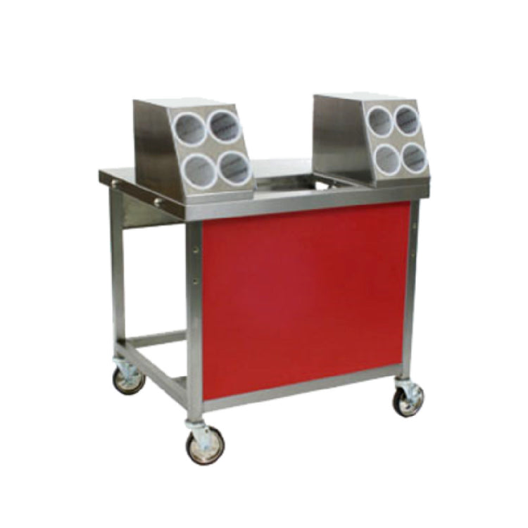 The Eagle DCS2-TSU Director's Choice® Tray & Silver Unit is a meticulously engineered storage solution measuring 36"W x 30"D x 34"H, specifically designed for environments requiring efficient management of tray and silverware storage. This unit boasts a formidable capacity to accommodate up to 100 trays each measuring 14" x 18", making it suitable for high-volume food service operations. It includes eight silver cylinders, providing ample space for organizing cutlery. The unit is constructed with a 16/304 stainless steel top, ensuring durability and resistance to corrosion, while the welded 1-1/2" square tubular open base with an apron on the operator side enhances structural integrity. Aesthetically, it features a laminated front panel in a vibrant holly berry red (Wilsonart® D307-60), mounted on an 18-gauge galvanized subpanel, adding a touch of modern elegance to its robust functionality. Mobility is facilitated by 5" casters, two of which are equipped with brakes for secure positioning. The entire unit is crafted from 304 stainless steel, guaranteeing longevity and compliance with NSF standards. This versatile unit serves various segments within the restaurant industry, offering a reliable and efficient solution for storage and organization needs.