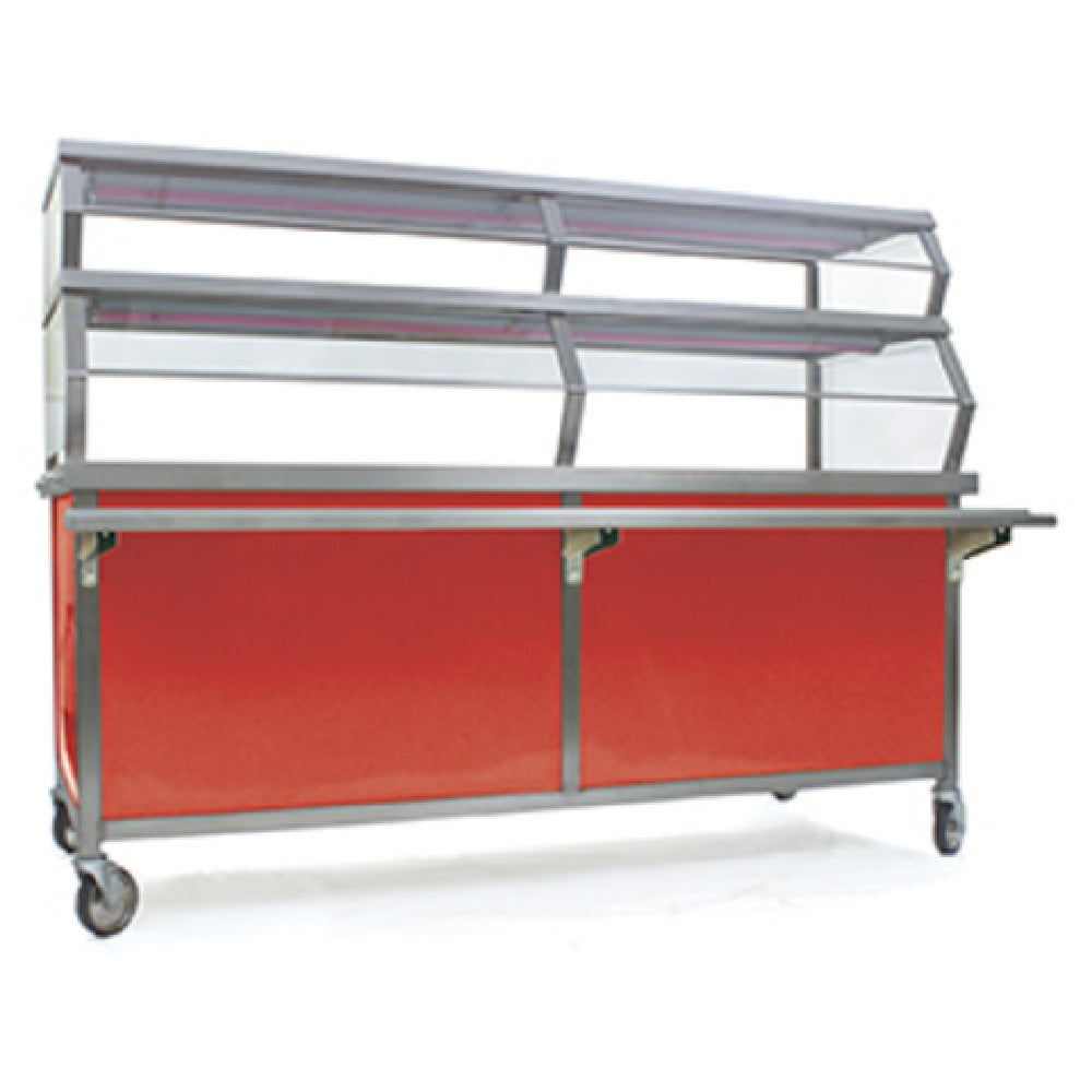 The Eagle DCS5-STURB Director's Choice® Solid Top Serving Unit With Refrigerated Base is a versatile solution designed for the food service industry, combining functionality with a sleek design. Measuring 78 inches in width, 30 inches in depth, and 34 inches in height, this unit features a 16/304 stainless steel top, ensuring durability and resistance to corrosion. Its self-contained condenser unit with thermostatic controls offers precise temperature management, making it ideal for maintaining food quality. The unit is built on a 1-1/2-inch square tubular base featuring a laminated front panel in holly berry red (Wilsonart D307-60) supported by an 18-gauge galvanized subpanel for added strength. It includes two doors on the operator side for easy access and is equipped with 5-inch poly tread casters, two of which are lockable for mobility and stability. Powered by a 1/4 horsepower motor, the unit operates at 120 volts, 60 Hz, with a single-phase output drawing 6.8 amps. It comes with a 6-foot cord and NEMA 5-15P plug. Certified by UL and NSF, this serving unit ensures compliance with health and safety standards, making it a reliable choice for restaurants, catering businesses, and institutional kitchens seeking optimal refrigerated serving solutions.