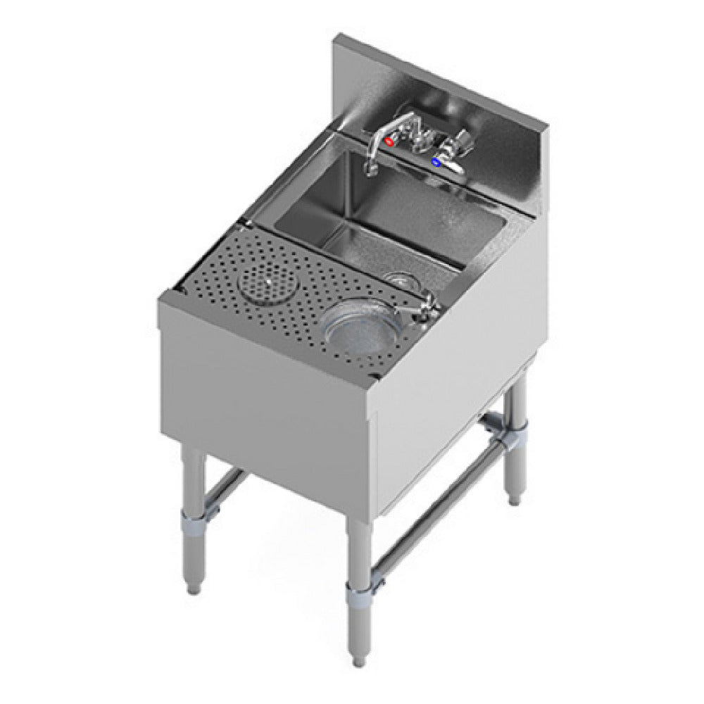 The Eagle DSGR-18-24 Eagle Spec-Bar® Dump Sink With Glass Rinser is a versatile component designed for high-demand environments, constructed with heavy gauge type 300 stainless steel for enhanced durability. This model features a robust body, legs, leg channels, and crossbracing, ensuring stability and longevity. Equipped with a T&S splash-mount faucet and a 1-1/2" stainless steel IPS threaded drain complete with nut and washer, it addresses the rigorous needs of commercial operations. The integrated glass rinser, with a 4-1/2" diameter actuation disk and 1/2" NPT barbed fitting, adds functionality, making it suitable for bars and restaurants that require efficient glass cleaning. An inline, preset pressure regulator is included to maintain optimal water flow, while the removable perforated drainboard offers convenience in maintenance. Designed with adjustable stainless steel bullet feet, it adapts to varied floor conditions. This model is 18" wide, incorporating a 10" x 14" x 7" sink and a dipper well with a 1-1/2" IPS drain and deck-mount faucet, making it a comprehensive solution for food service establishments seeking a reliable and efficient dump sink with advanced features.
